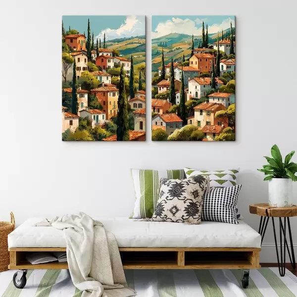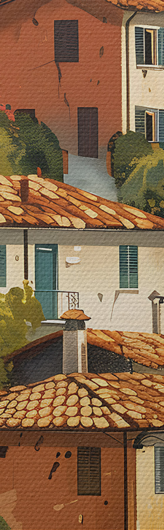 Glezna Vidusjūras kalnu ciemats, siltos toņos krāsotas mājas ar terakotas jumtiem Nr m30097