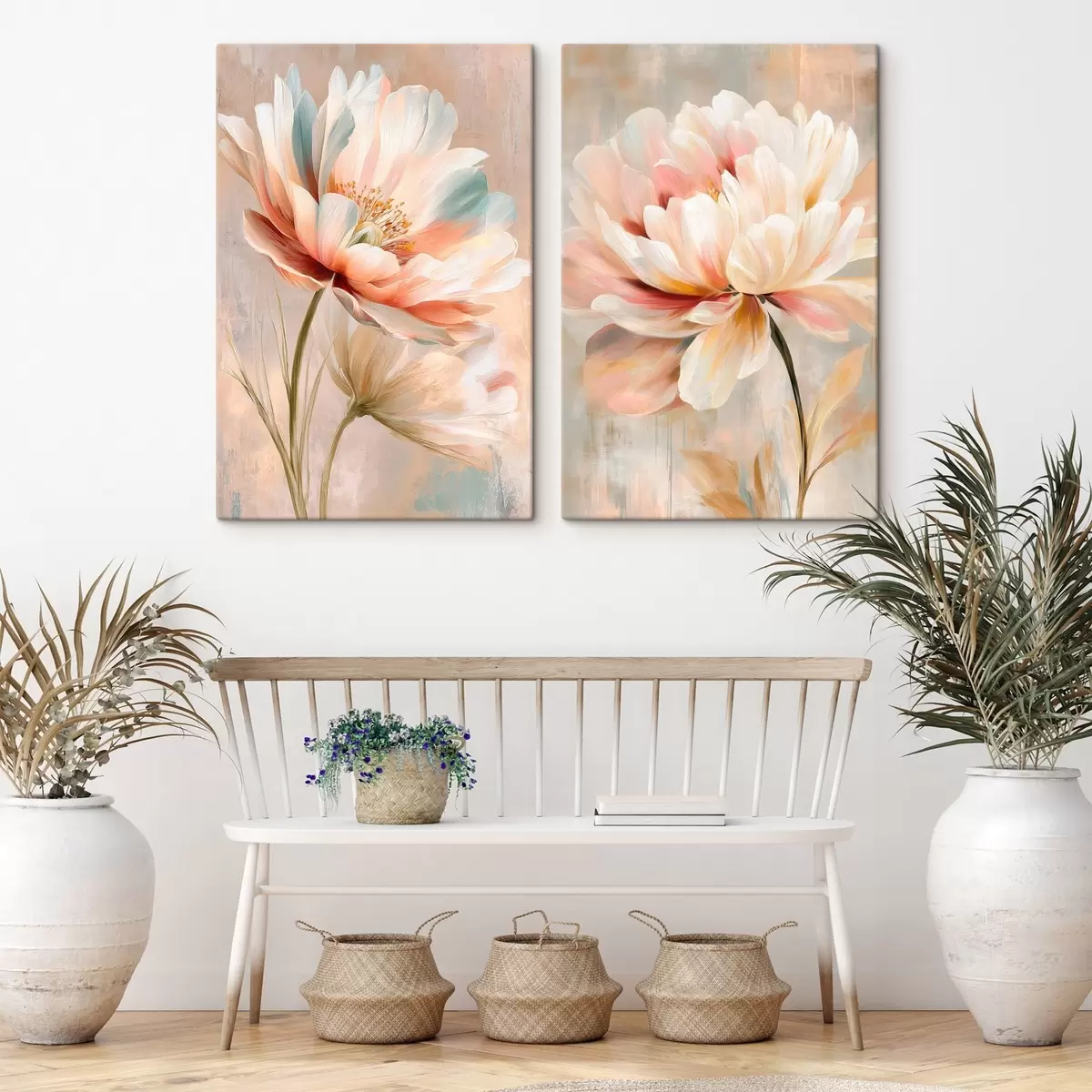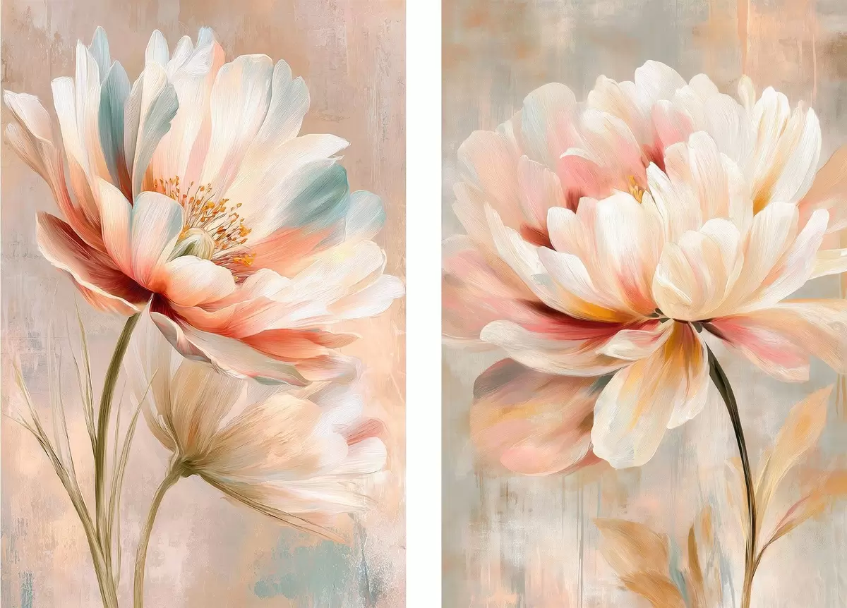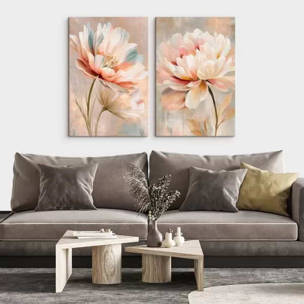 Glezna Divdaļīgs plakāts ar lieliem ziediem smilškrāsas un rozā toņos mākslas plakāta stilā Nr m30134