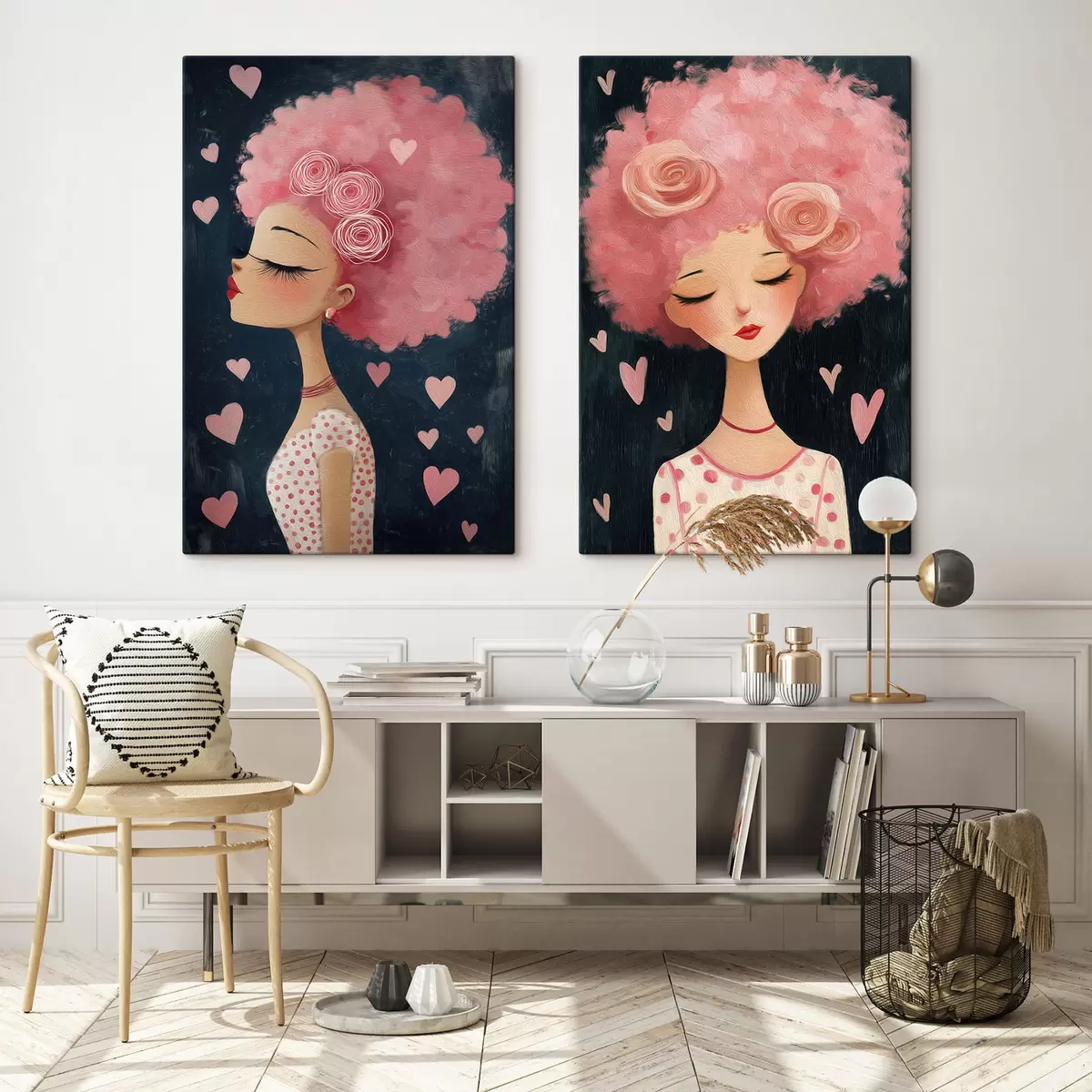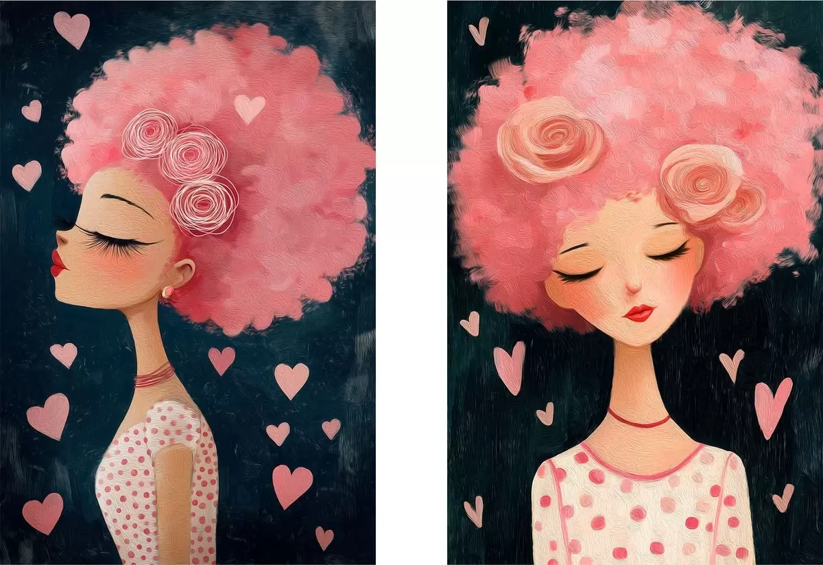 Glezna Meitene ar rozā matiem un sirdīm Nr m30156