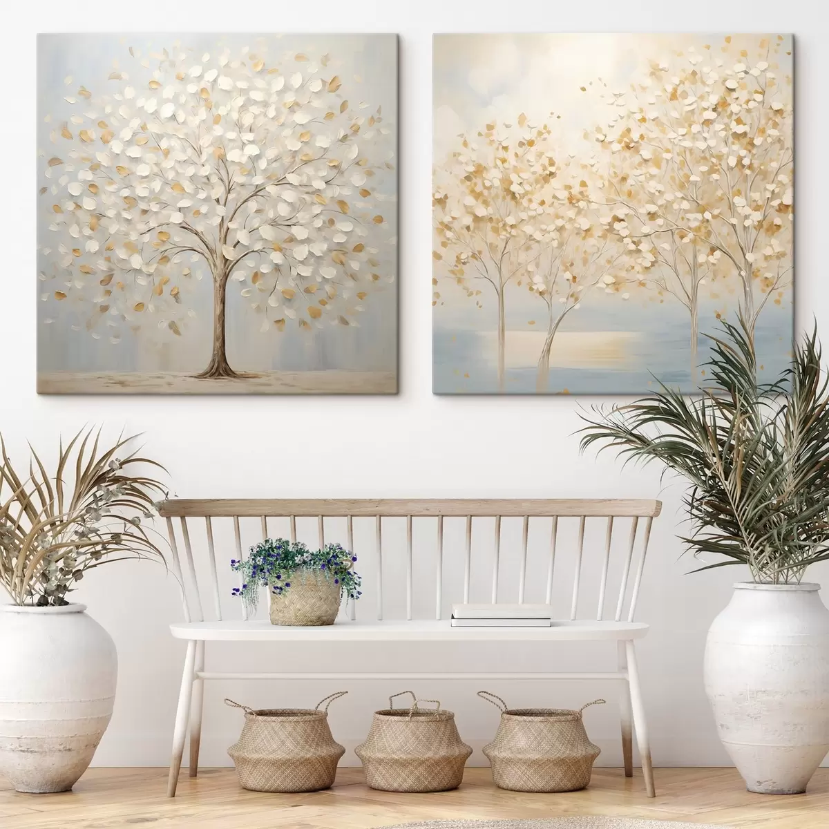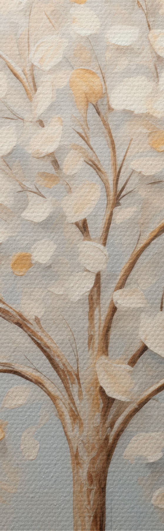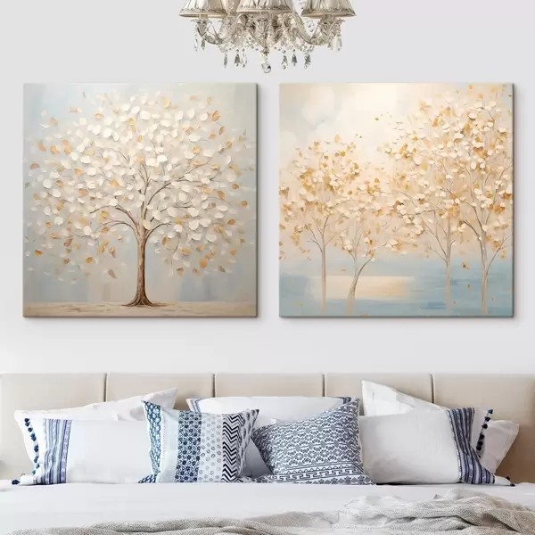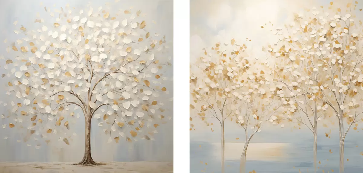 Glezna Teksturēts glezniecības stils, kurā attēloti koki ar baltām un dzeltenām lapām uz gaiši zila fona Nr m30200