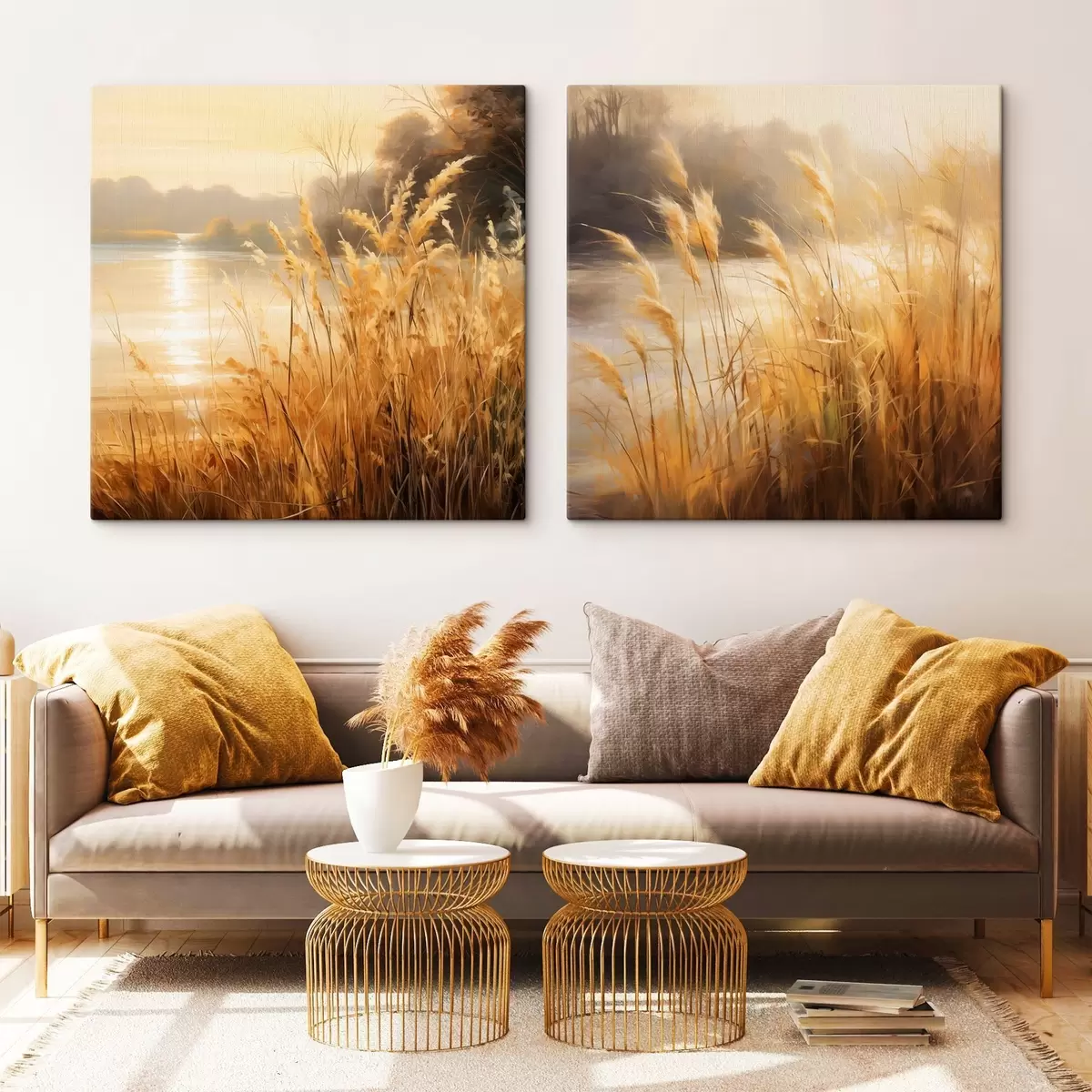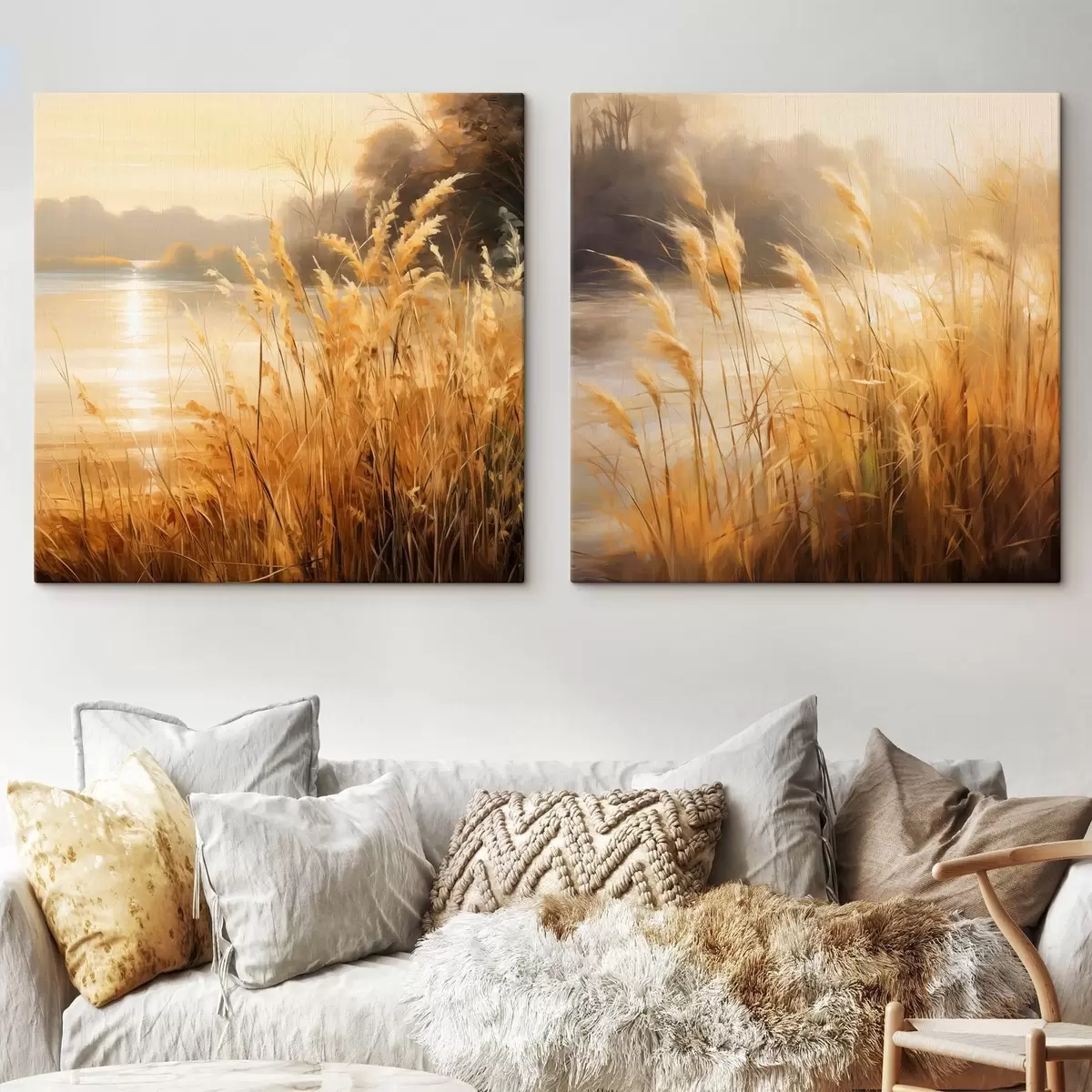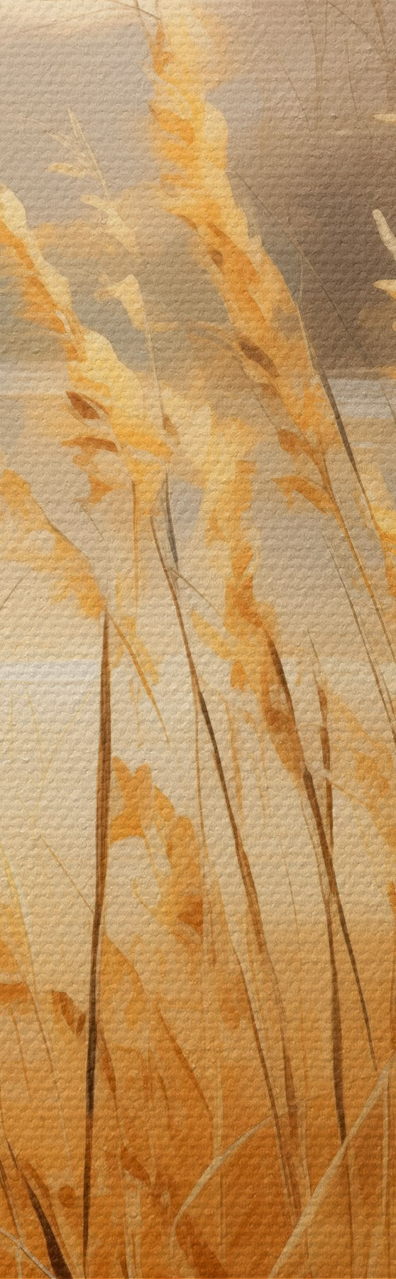 Glezna Priekšplānā augsta, sausa zāle ar vārpiņām, fonā – ezers un koki Nr m30201