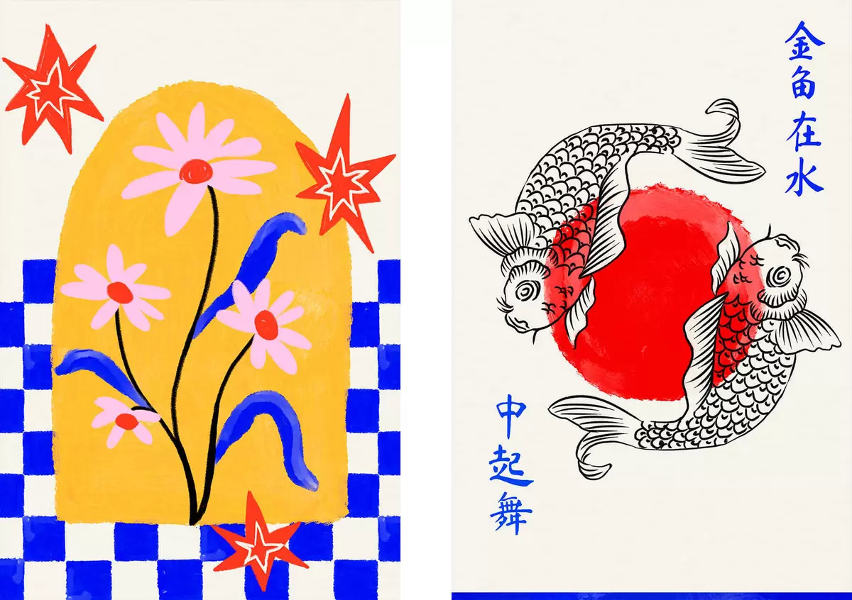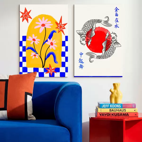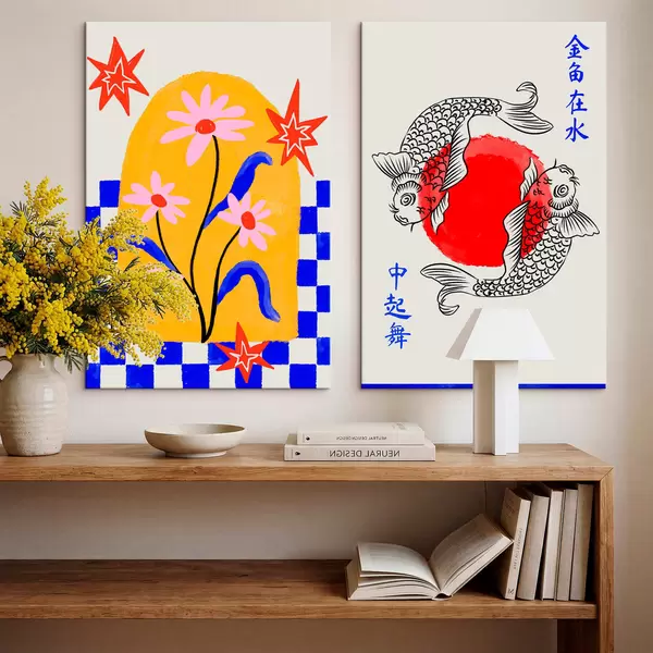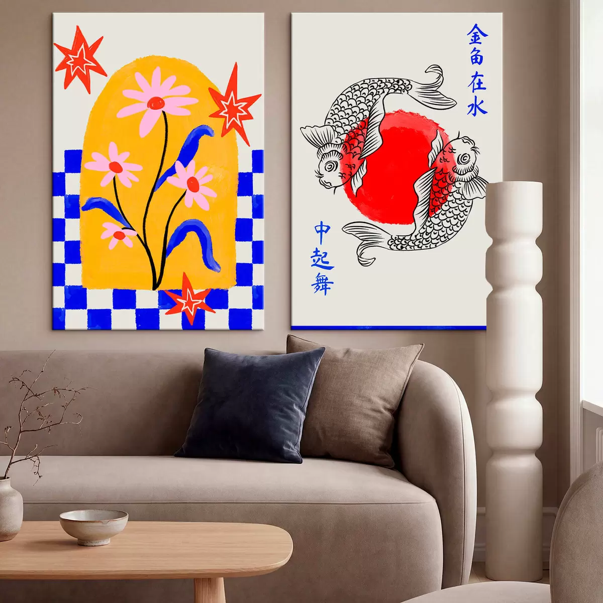 Glezna Divdaļīgs darbs ar kaķi un divām zivīm sarkanos un baltos toņos Nr m30235