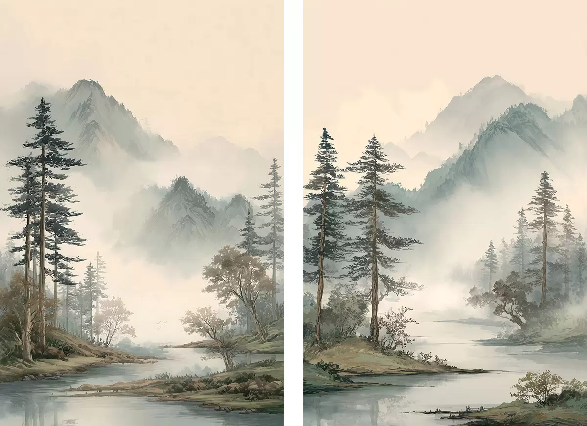Glezna kalnu ainava ar priedēm un upi Nr m30262
