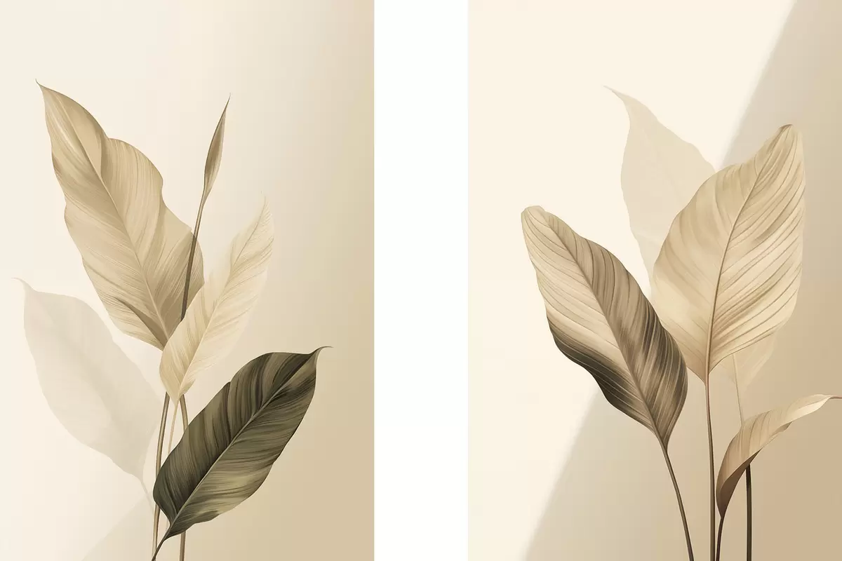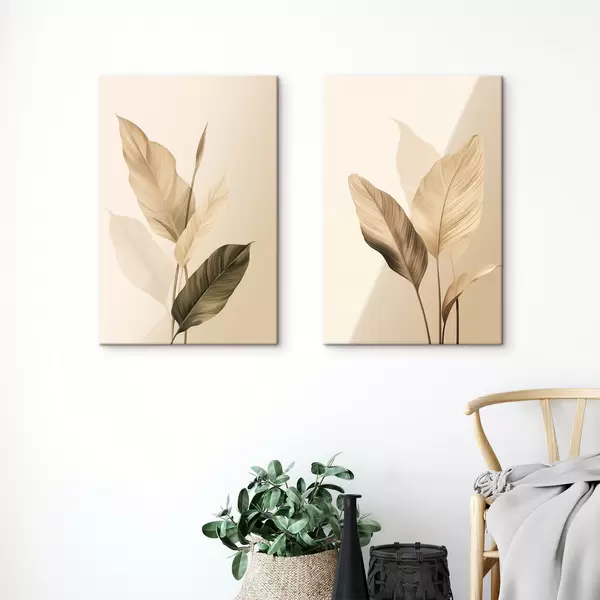 Glezna Lielas tropu lapas smilškrāsas un brūnos toņos, gaišs fons Nr m30313