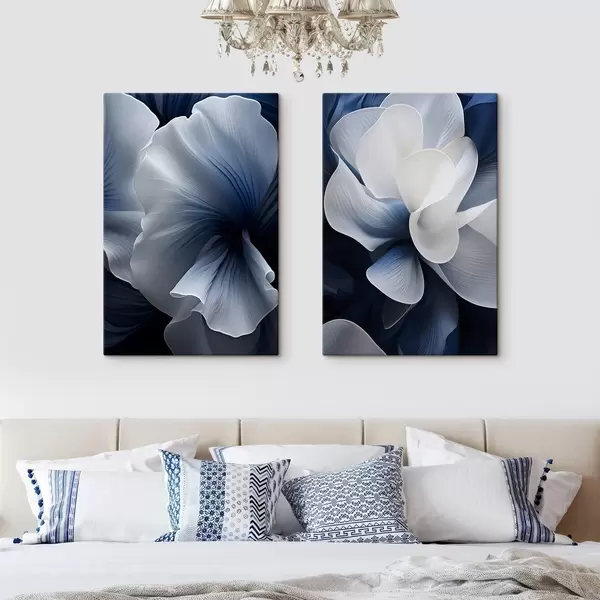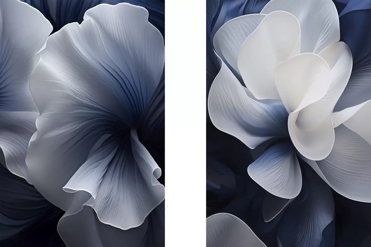 Glezna Abstrakti zili un baltu ziedu ziedlapiņas uz tumša fona Nr m30316