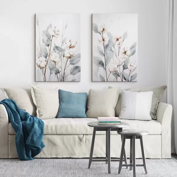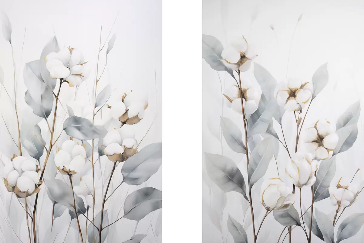 Glezna Balta kokvilnas auga ar gaiši zilsarkanām lapām uz gaiša fona Nr m30322