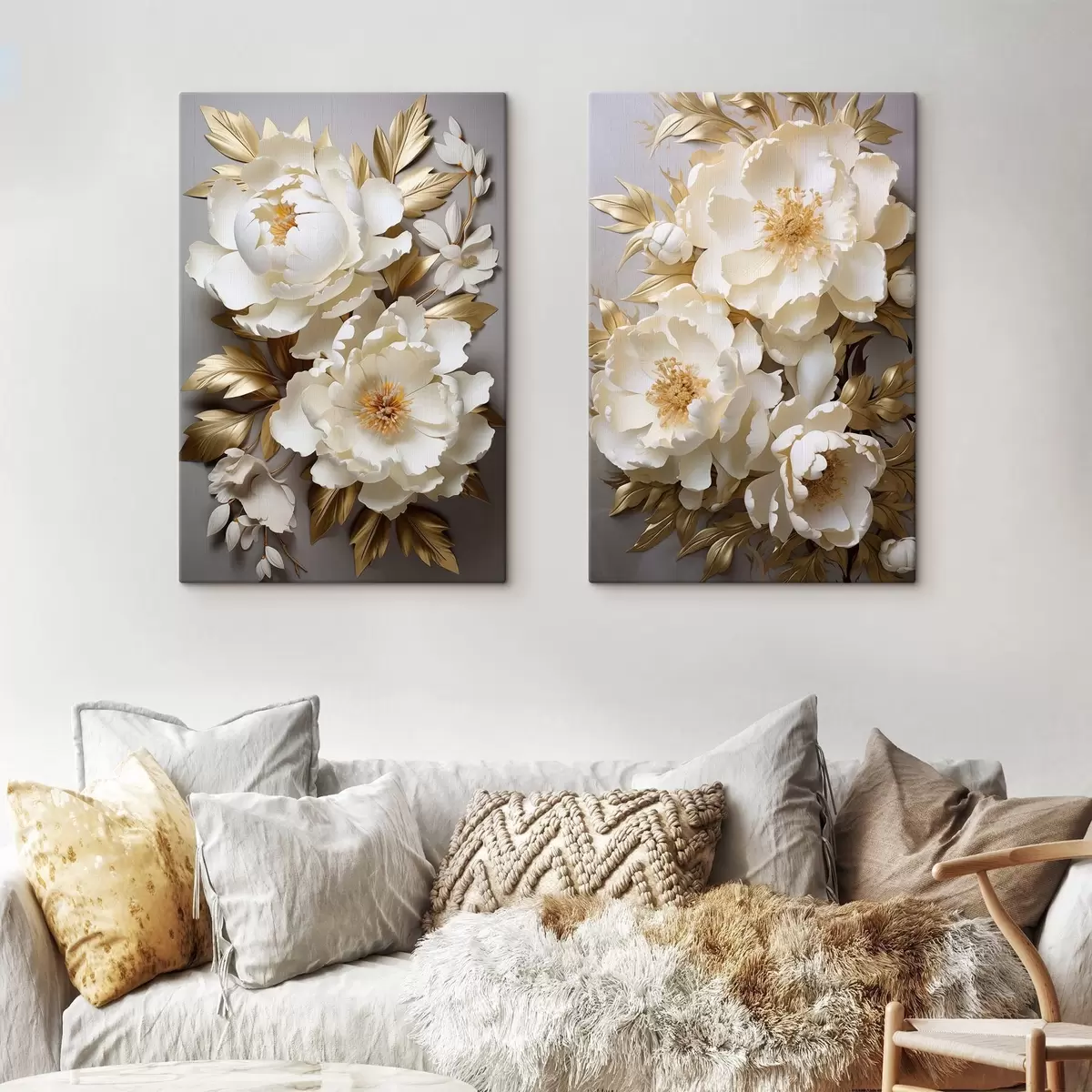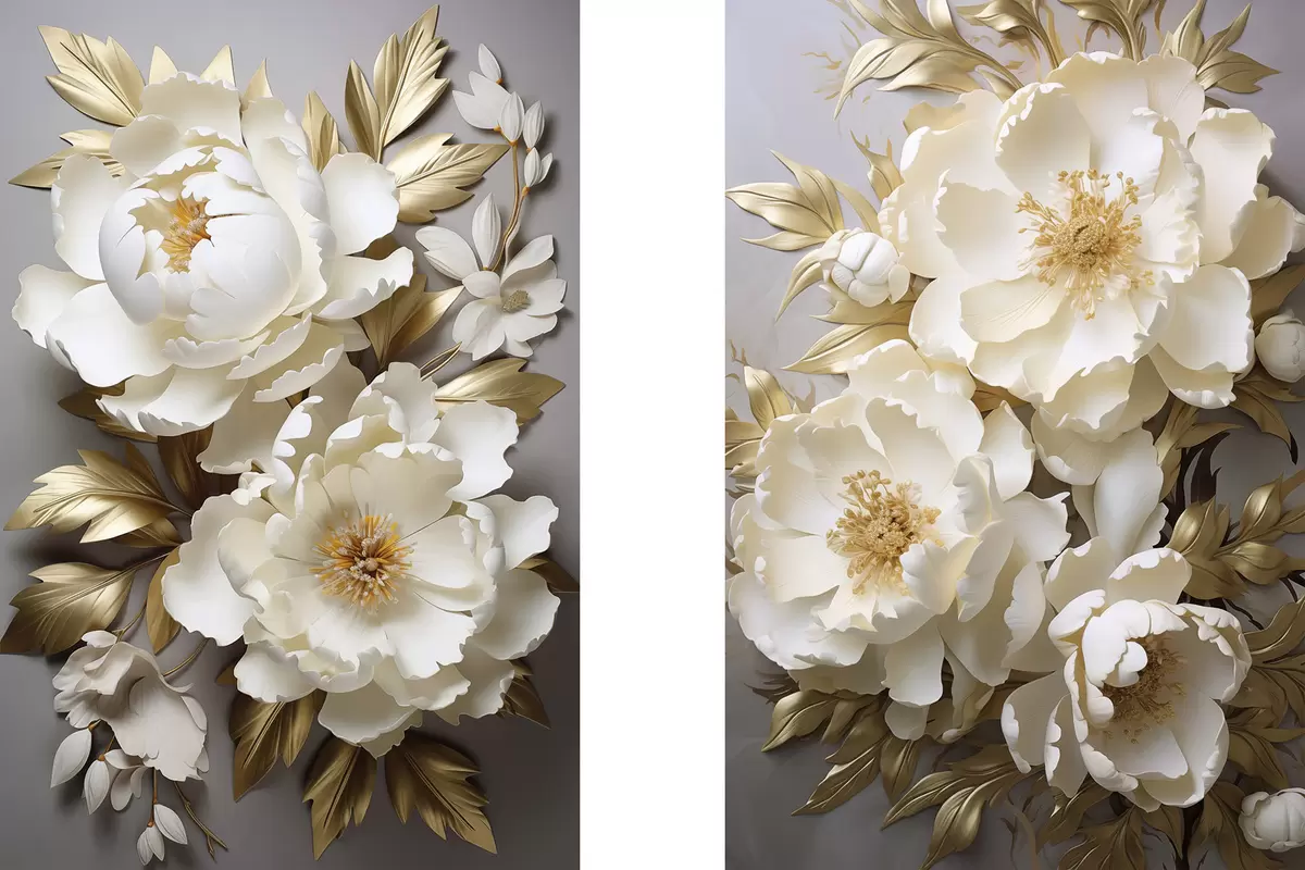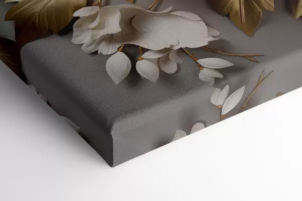 Glezna Lielas baltas peonijas ar dzeltenām lapām uz pelēka fona Nr m30327