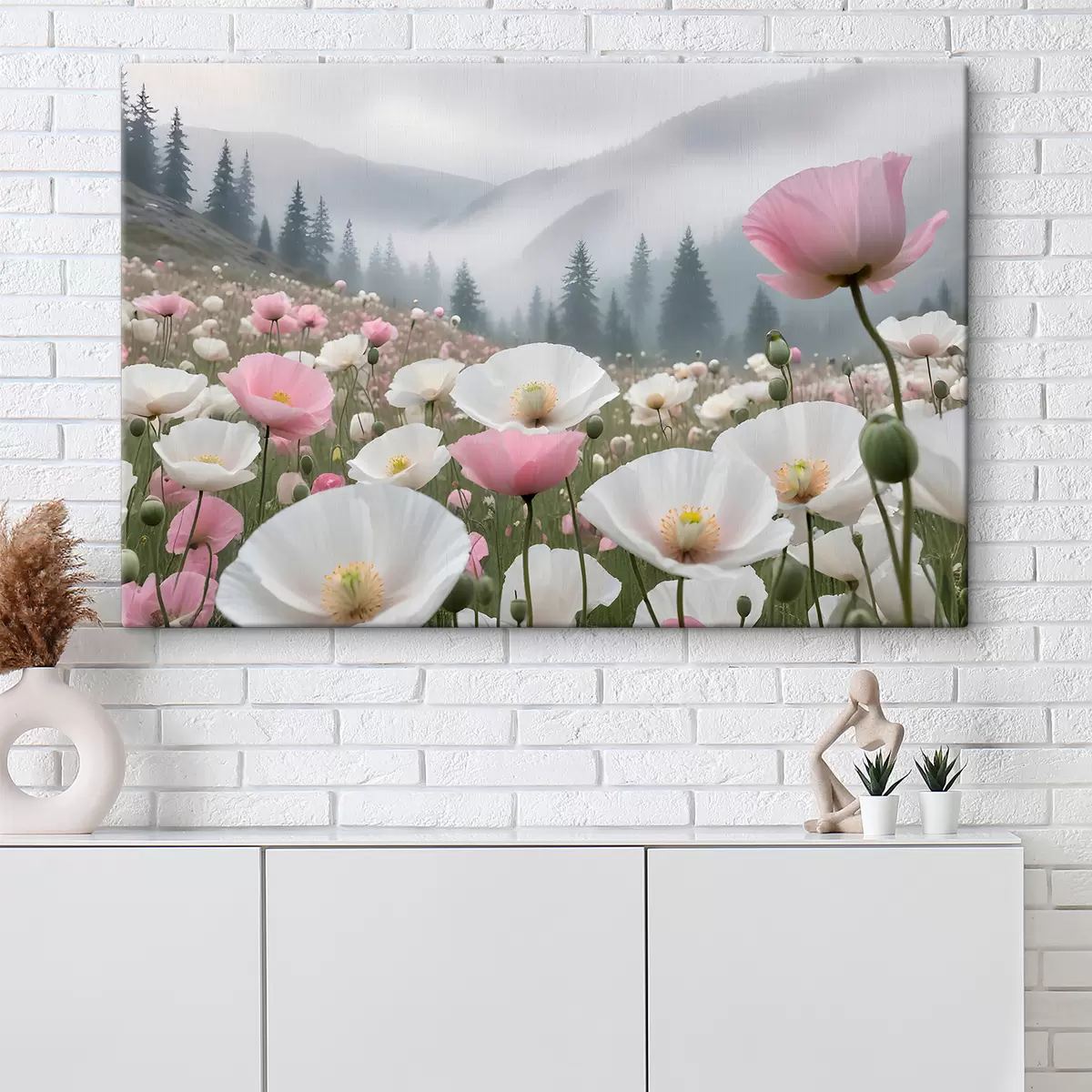Glezna Rozā un balto magoņu lauks kalnu ainavā fonā Nr s38369