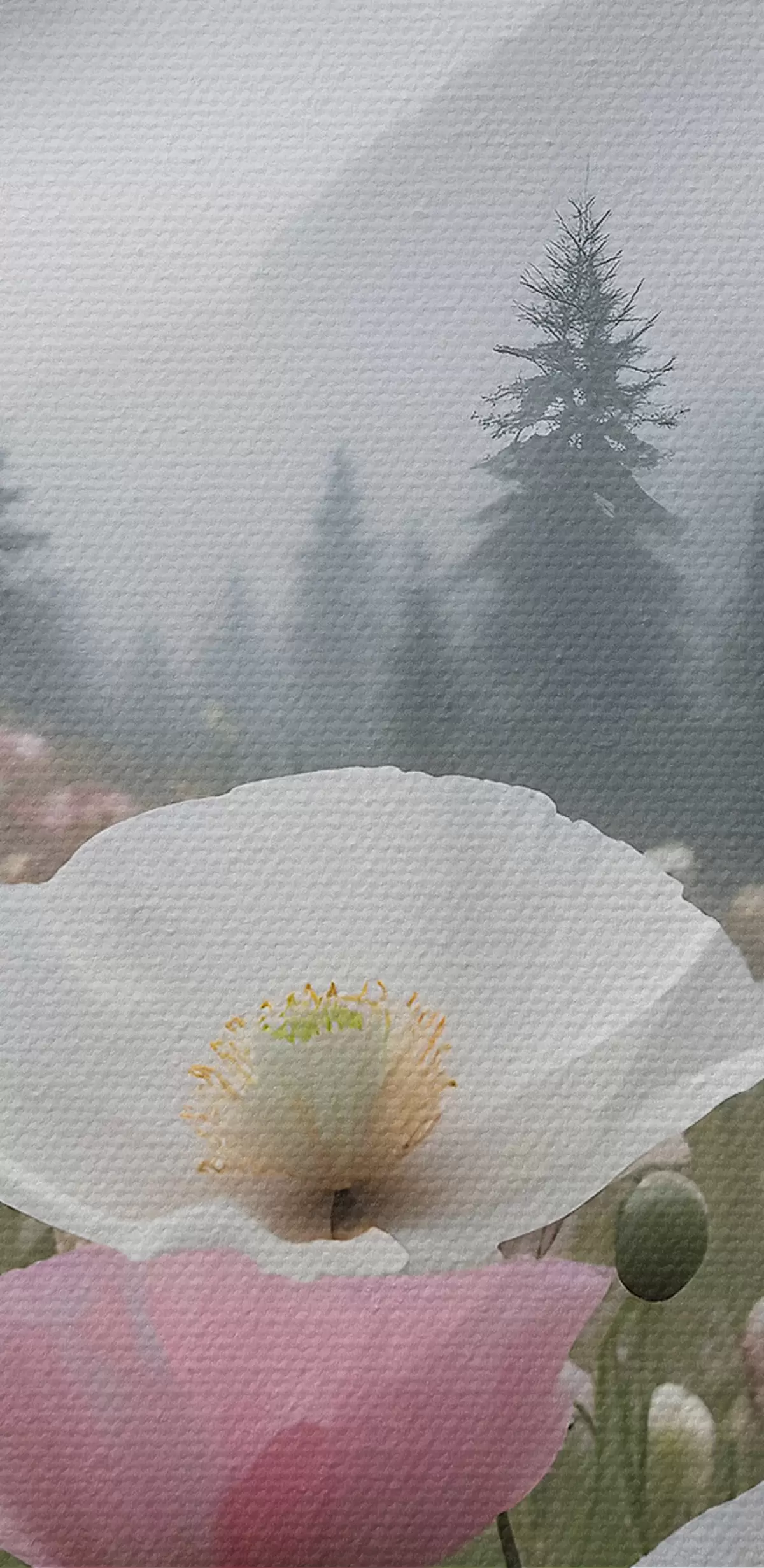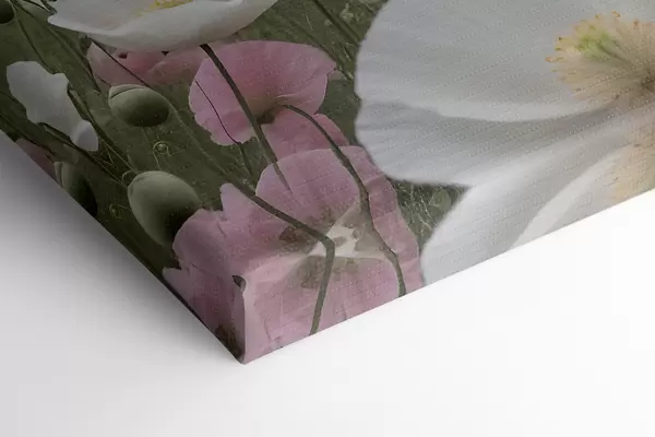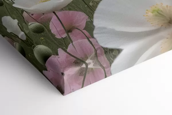 Glezna Rozā un balto magoņu lauks kalnu ainavā fonā s38369