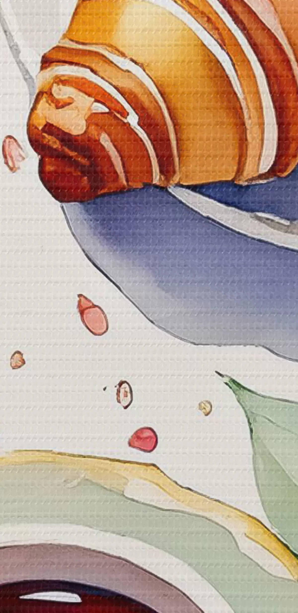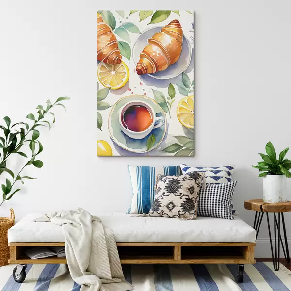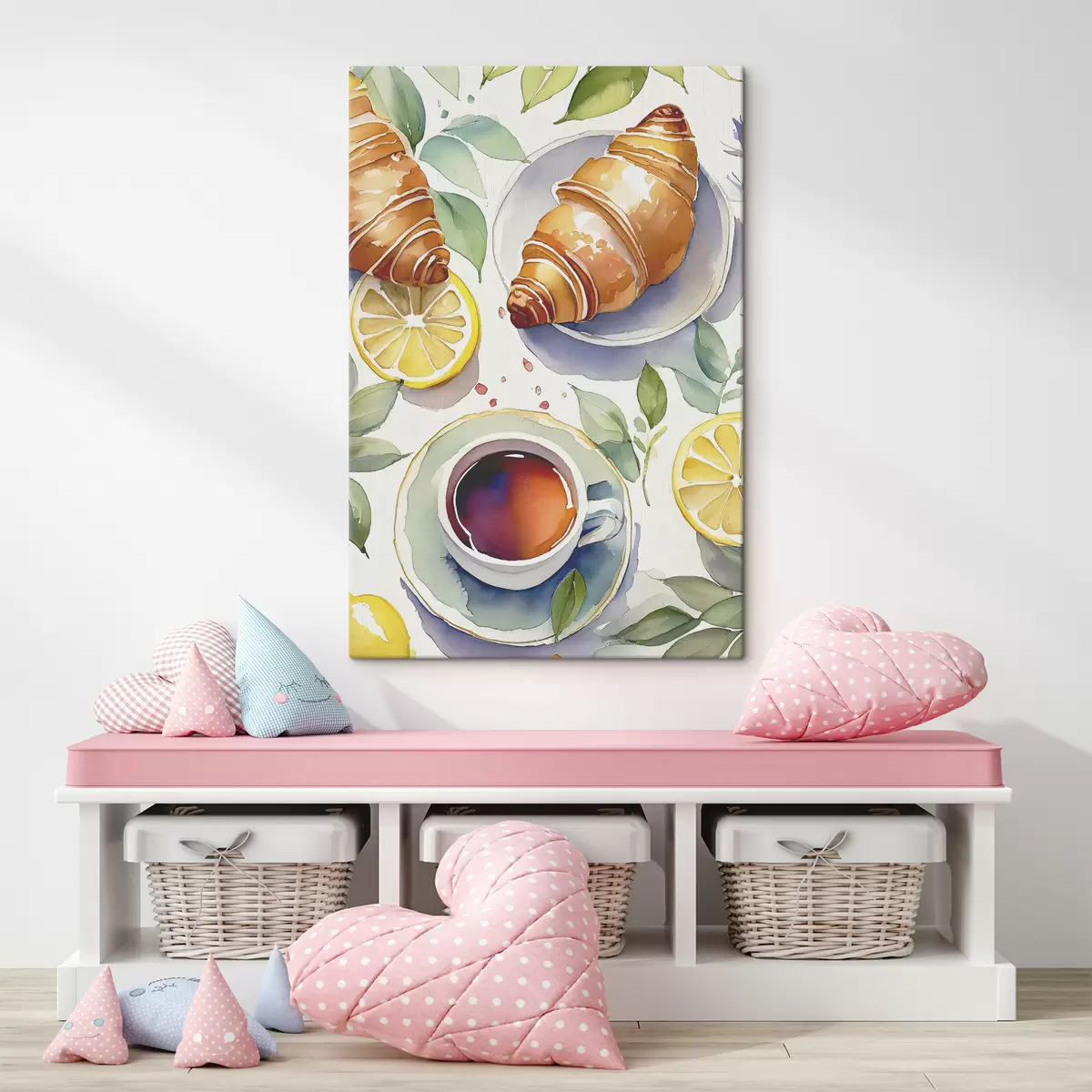 Glezna Kruasāna akvarelis, tējas tase, brokastis, citroni, lauku stilā Nr s38389