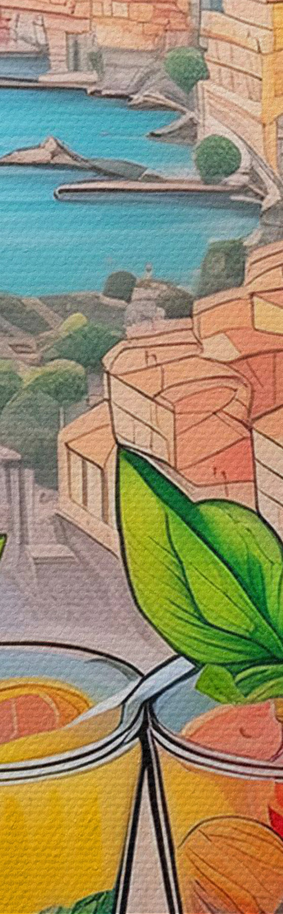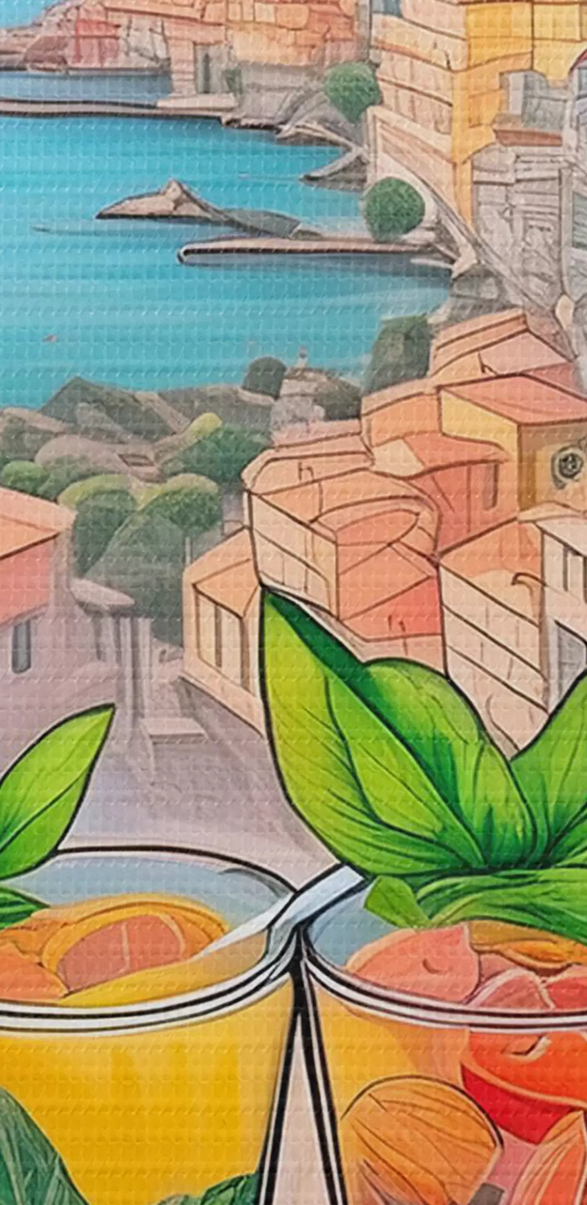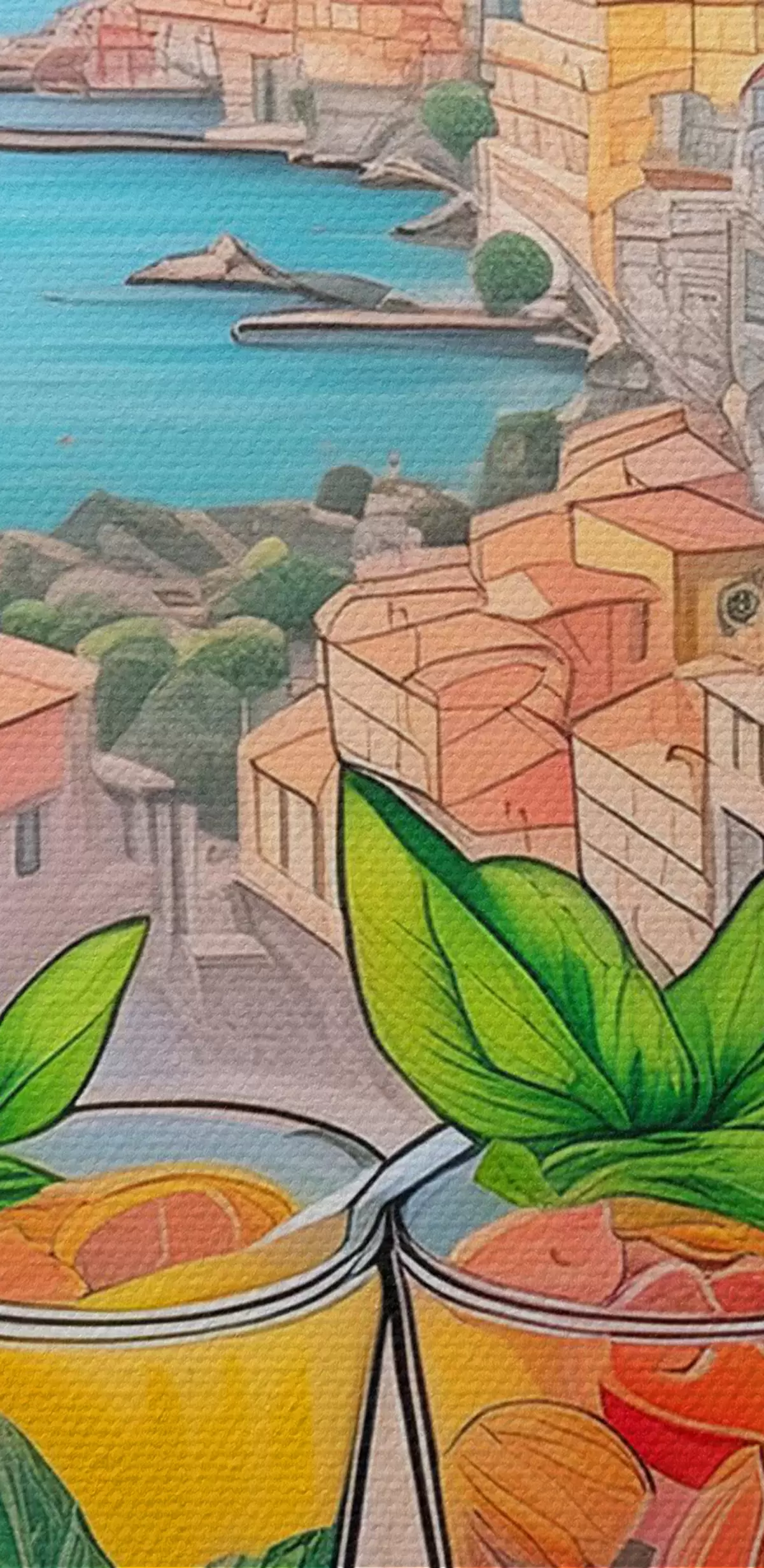 Glezna Itālijas pilsēta, jūras piekraste, kokteiļi, aicinājums, arhitektūra, vasara, akvarelis  s38392