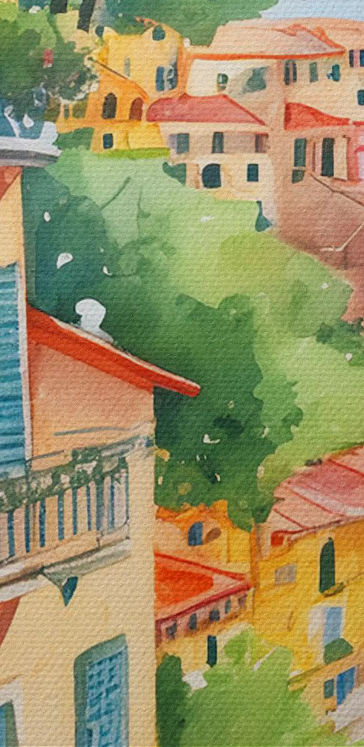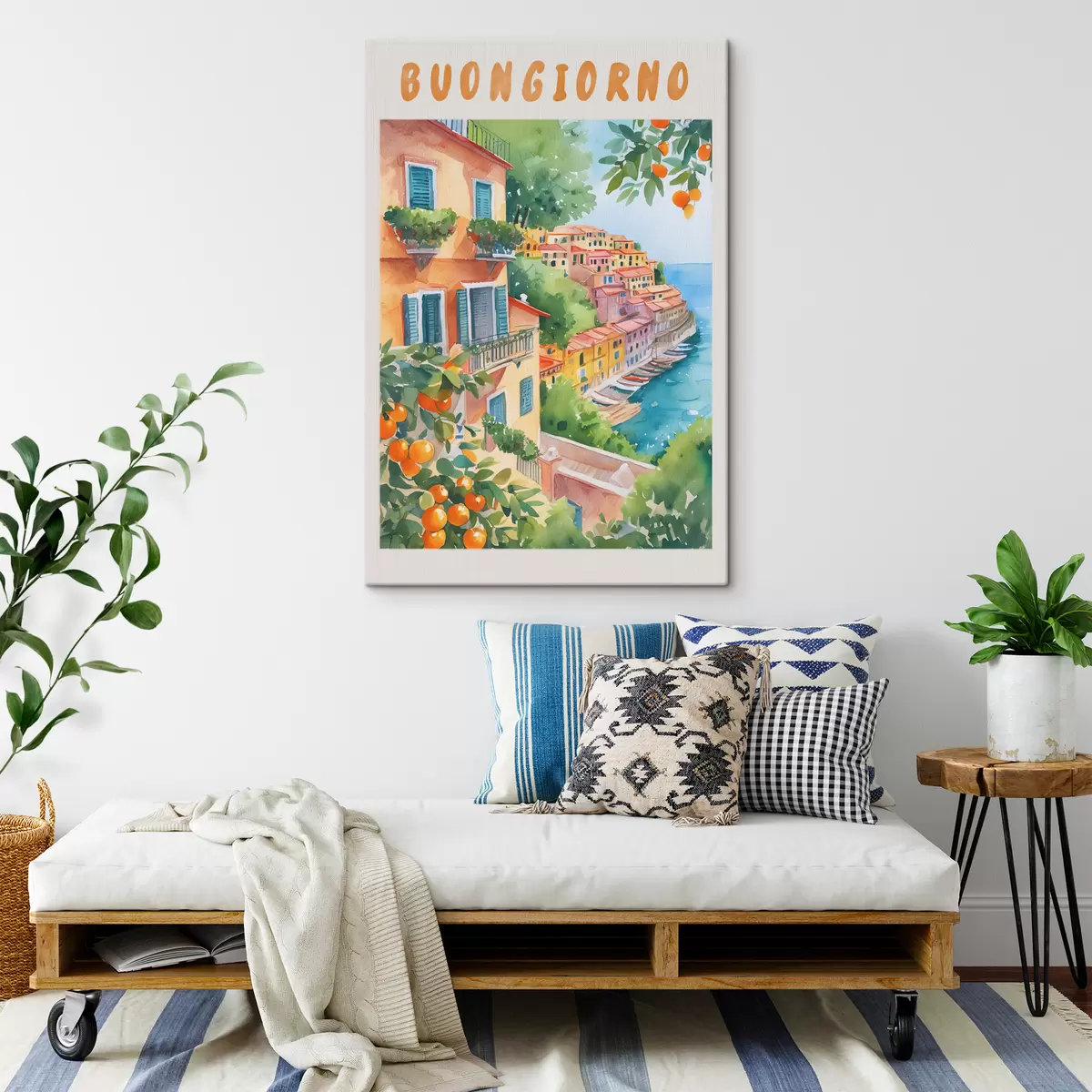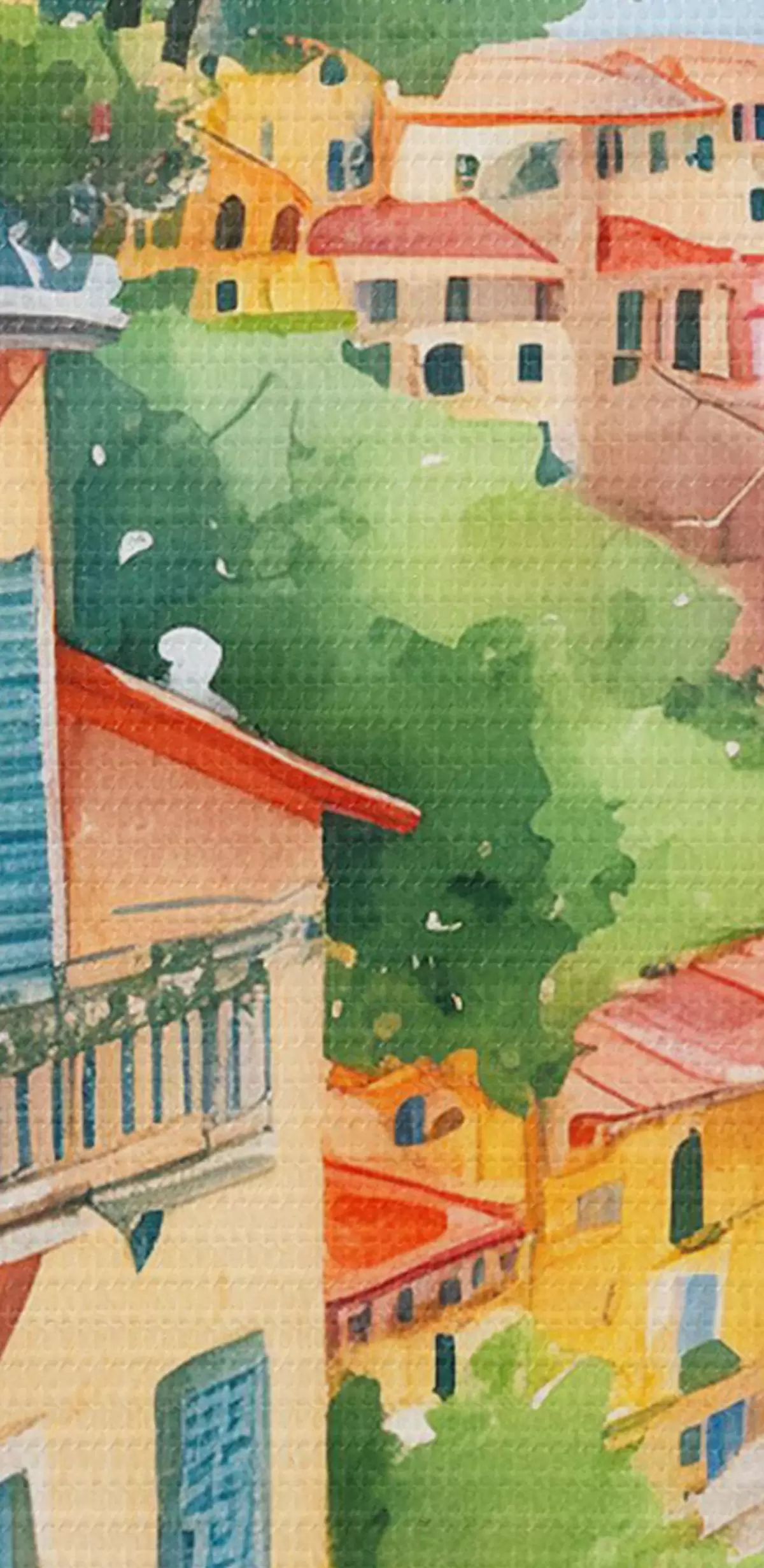Glezna Itālijas pilsētas arhitektūra, Amalfi jūras piekraste, vasara, akvarelis, citronkoks s38393