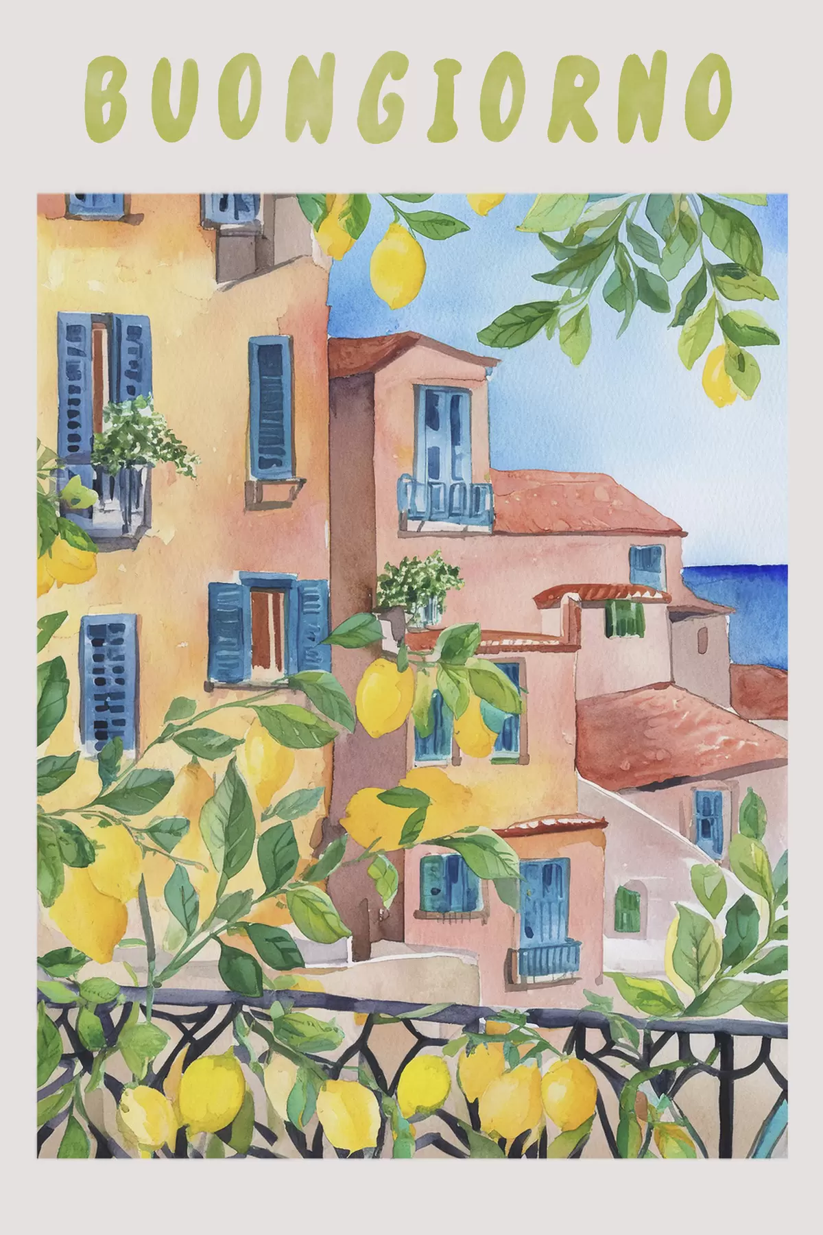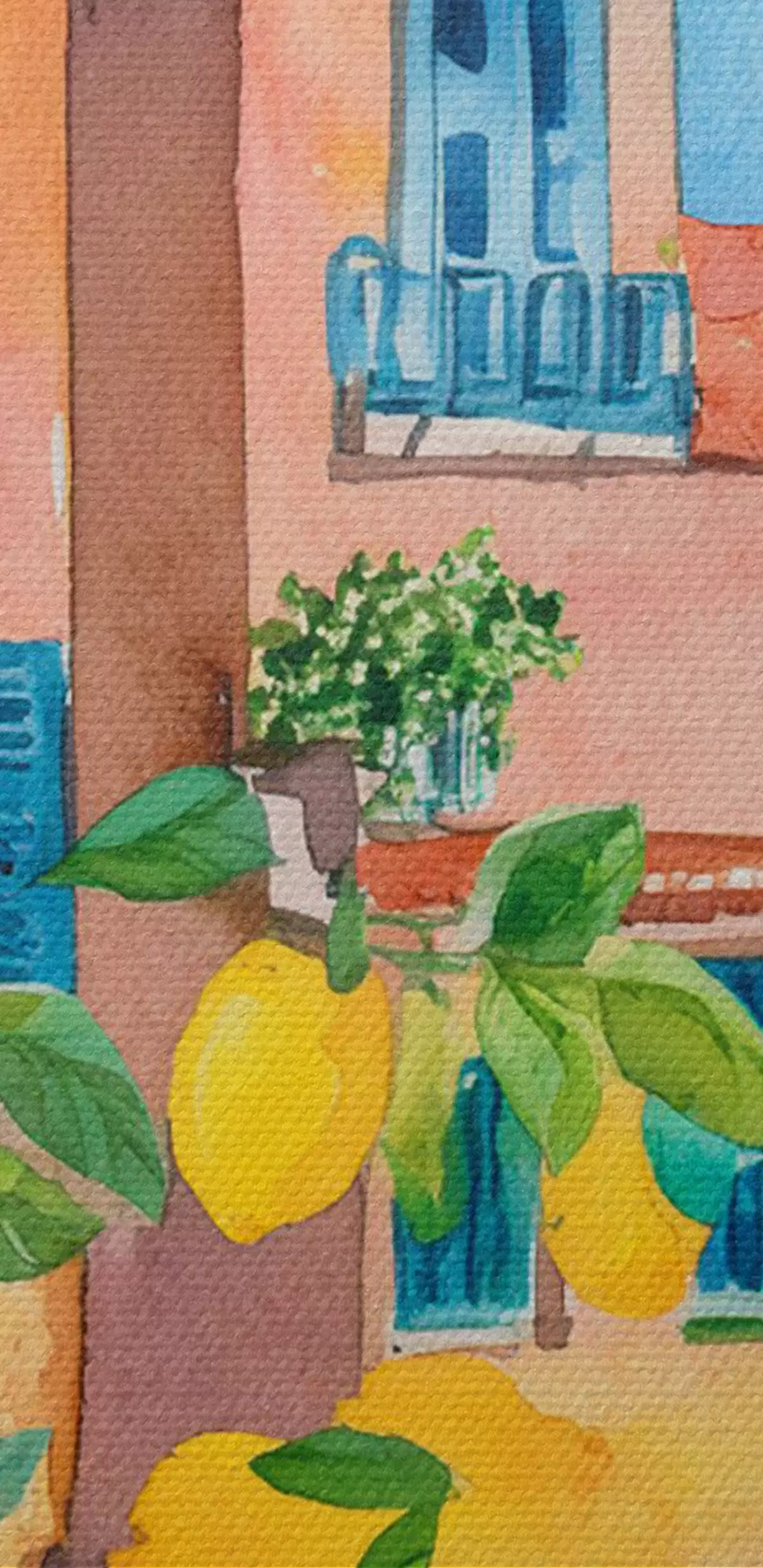 Glezna Itālijas pilsētas arhitektūra, jūras piekraste, vasara, akvarelis, citronkoks s38395