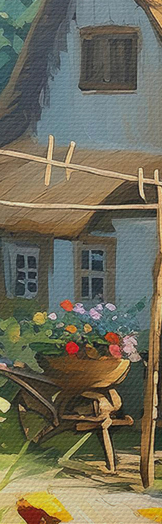 Glezna Ciema māja ar dārzu, vasaras puķēm, eļļas krāsu, otas triepieniem, lauku, lauku stilā s38491
