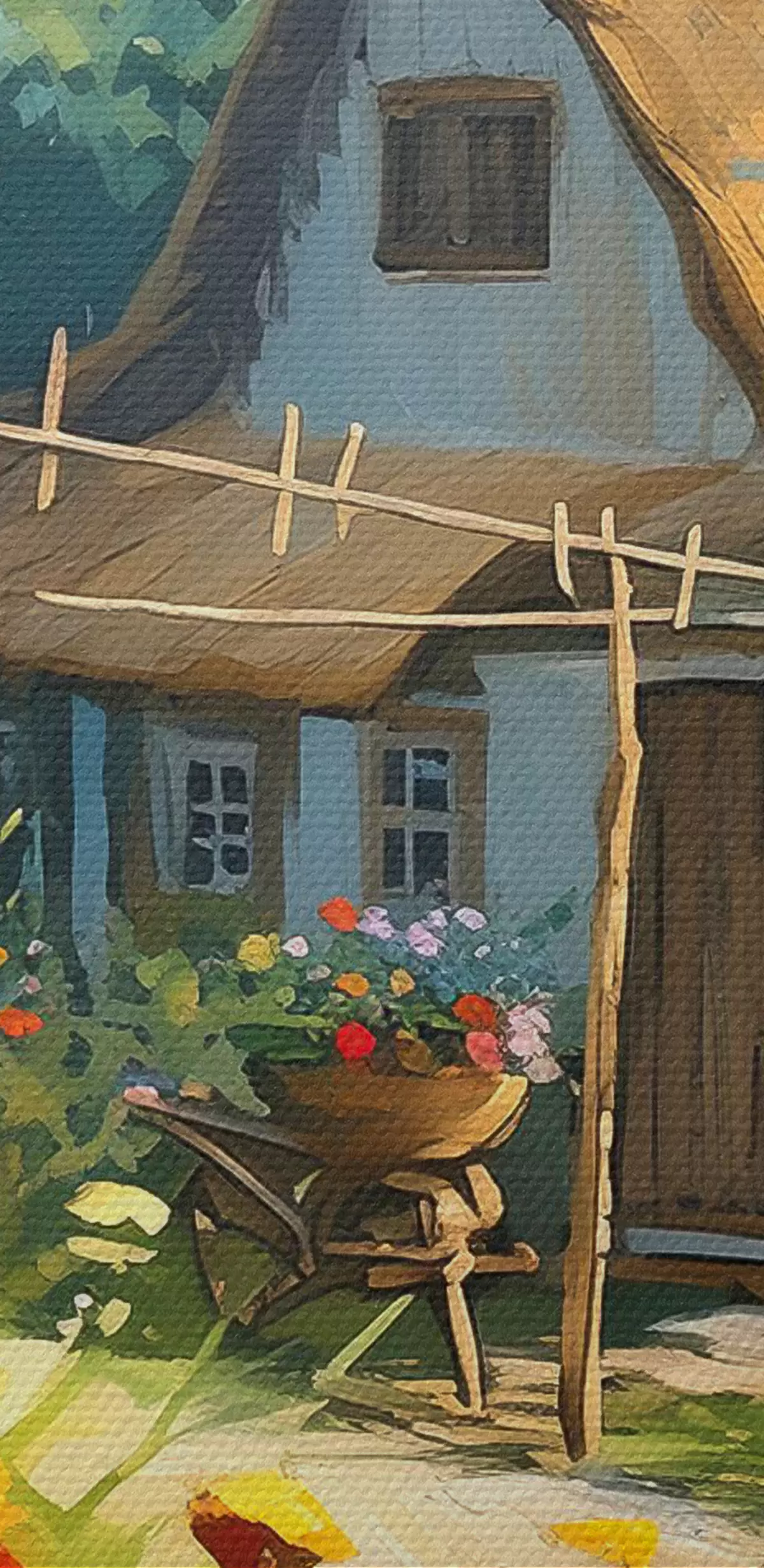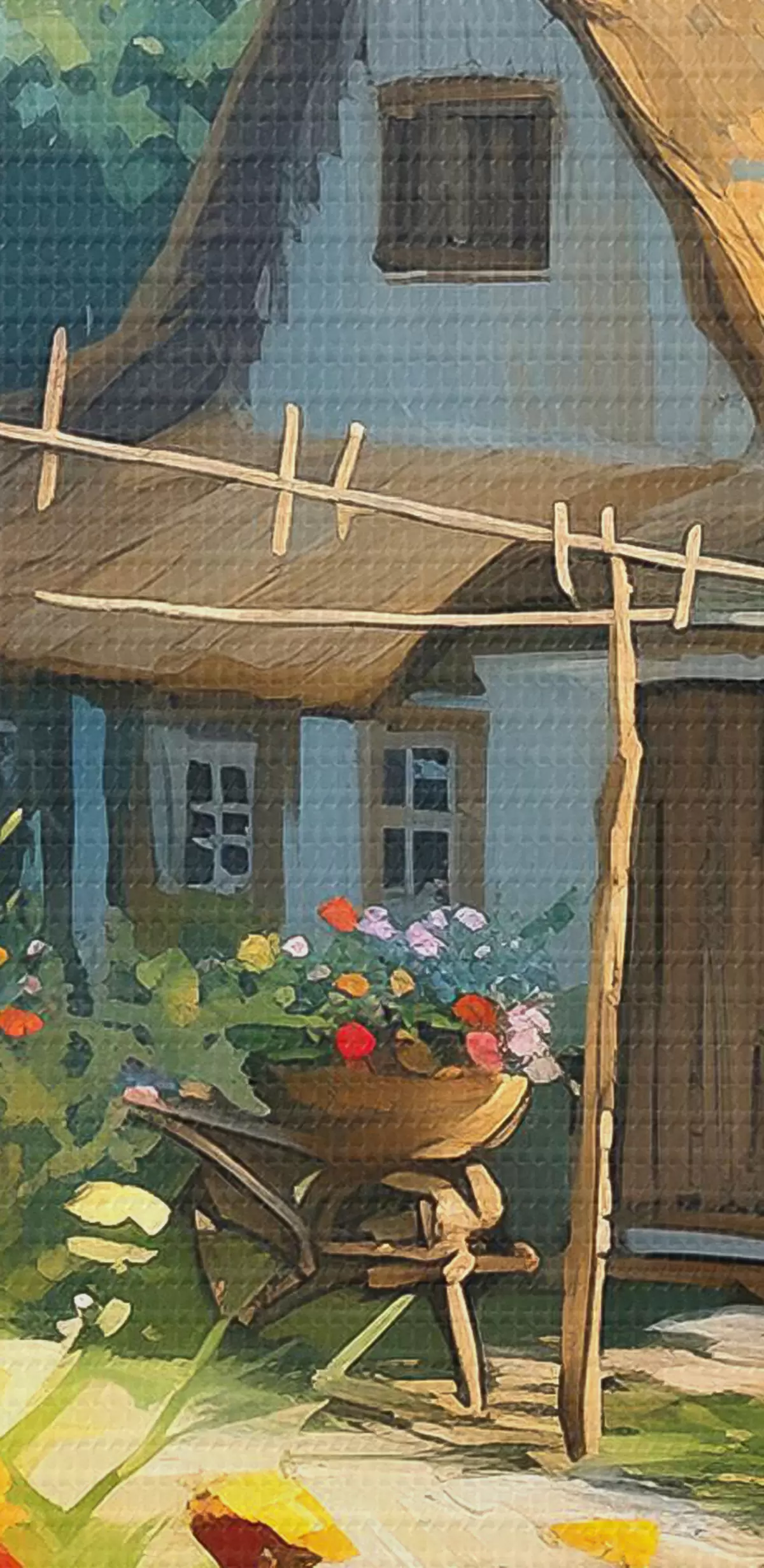 Glezna Ciema māja ar dārzu, vasaras puķēm, eļļas krāsu, otas triepieniem, lauku, lauku stilā s38491