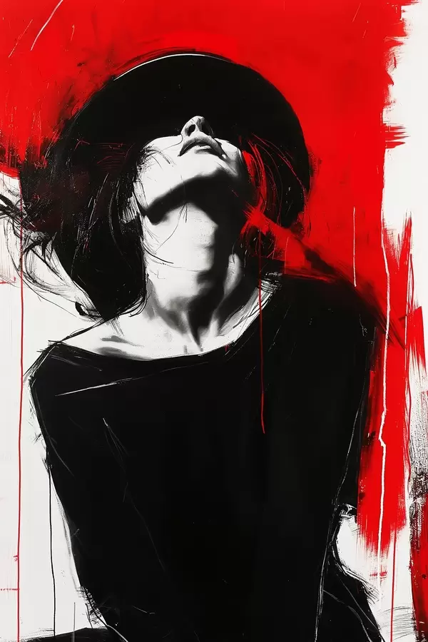 Glezna Sieviete ar melnu cepuri uz sarkana fona s38561