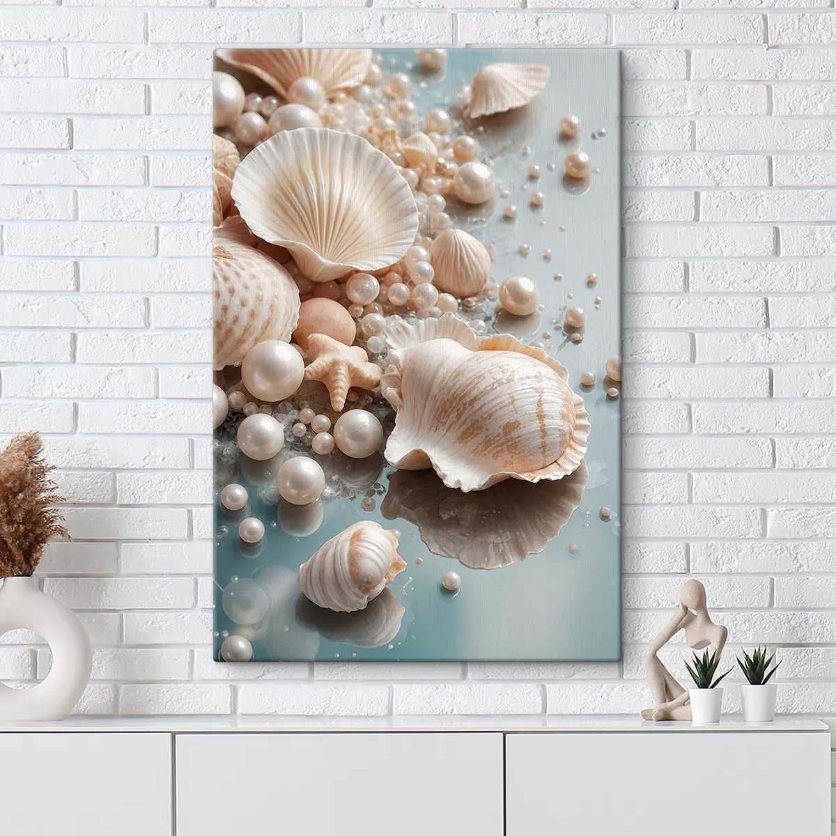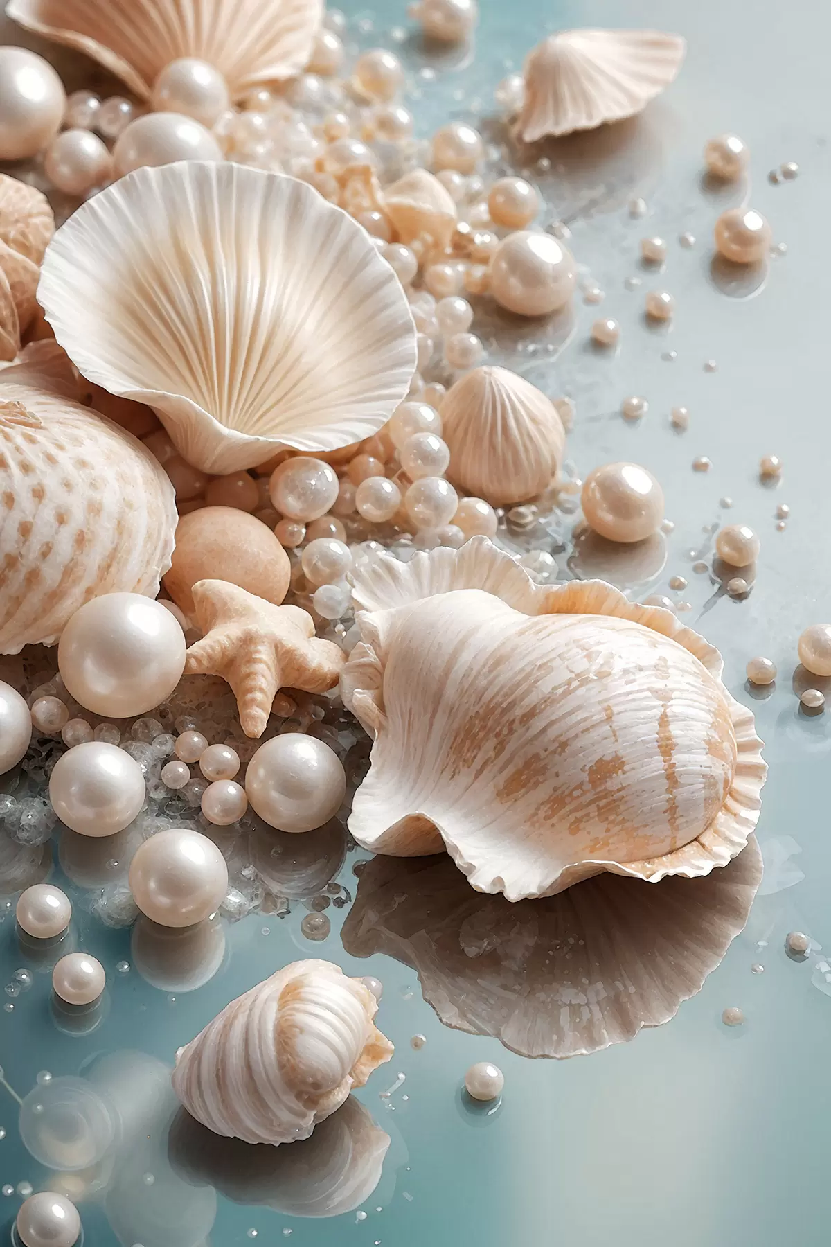 Glezna Jūras gliemežvāku un pērļu asorti uz gaiši zila fona s38769