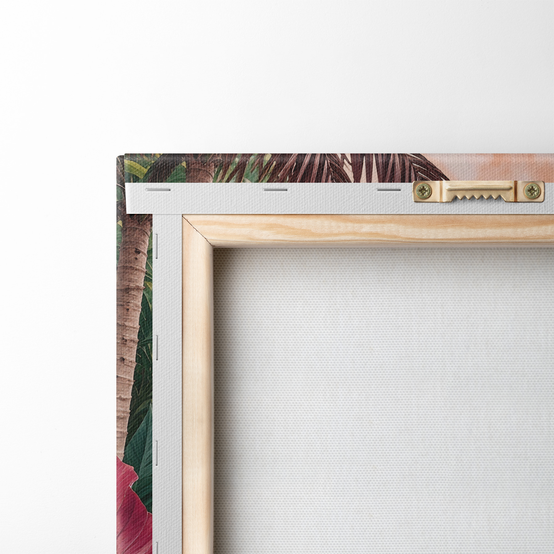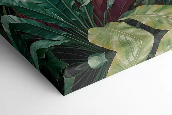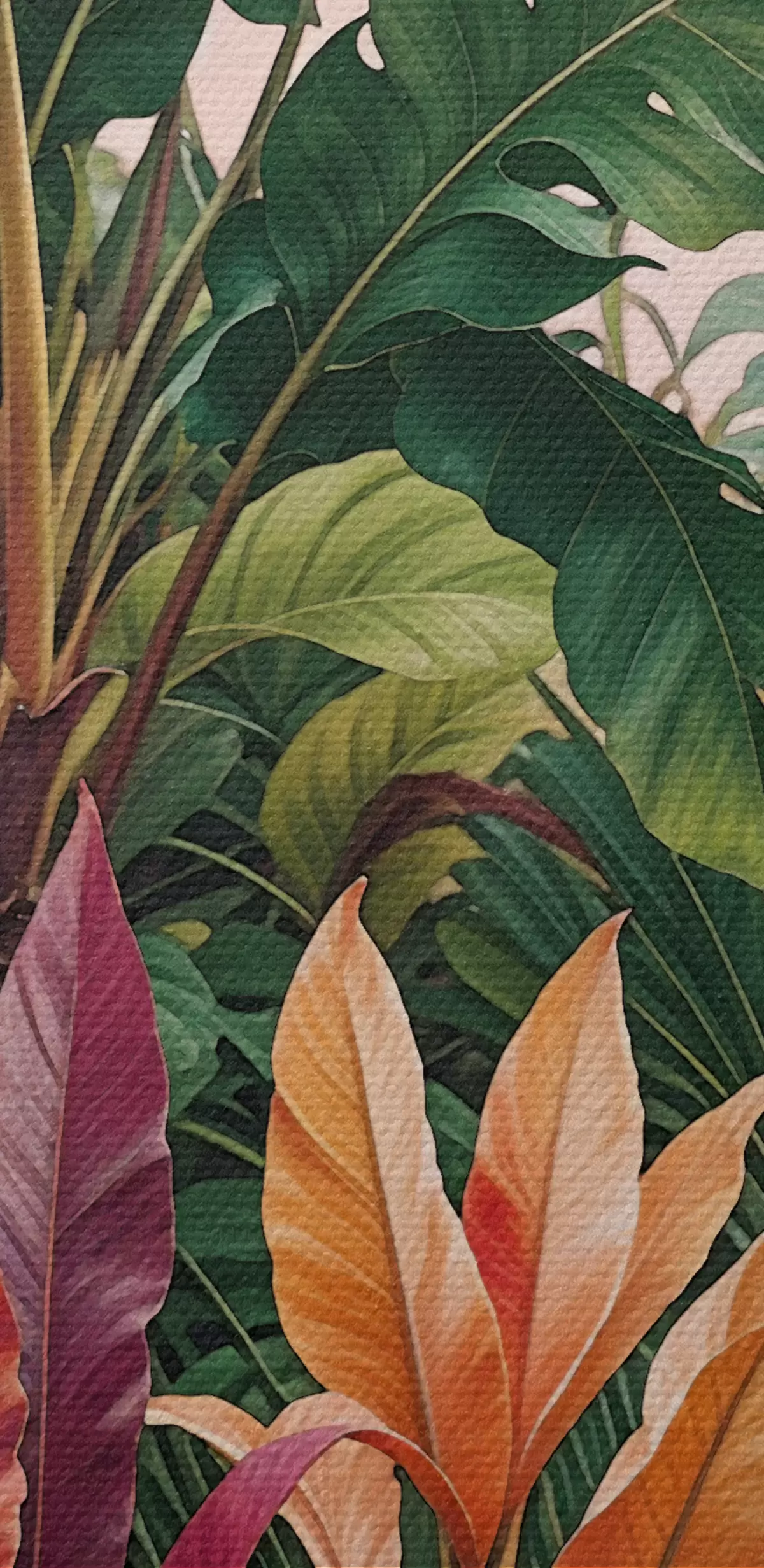 Glezna Sulīgi, tropiski džungļi ar koši zaļām lapām, palmu lapiņām un krāsainiem ziediem s38817
