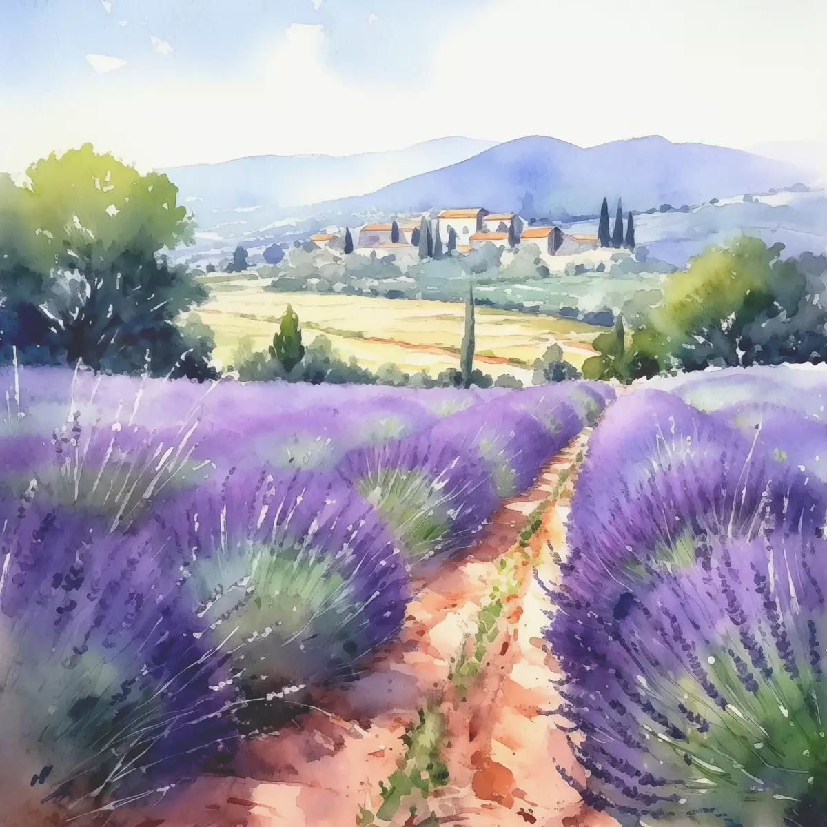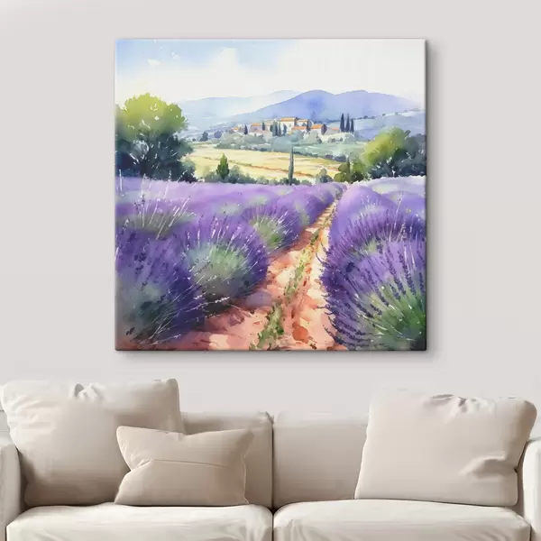 Glezna Akvareļu lavandas lauks uz kalnu un lauku fona Nr s38913