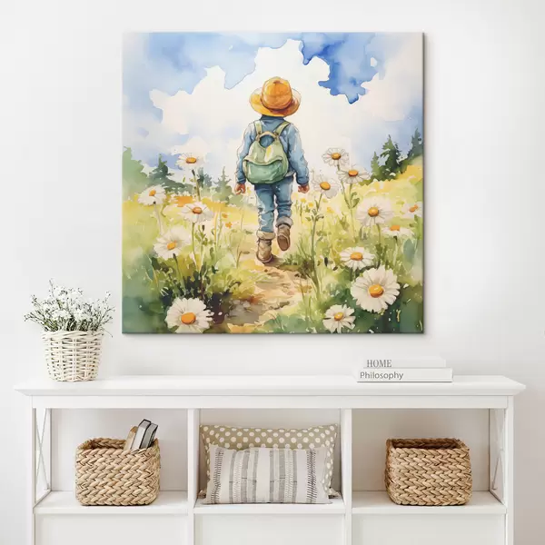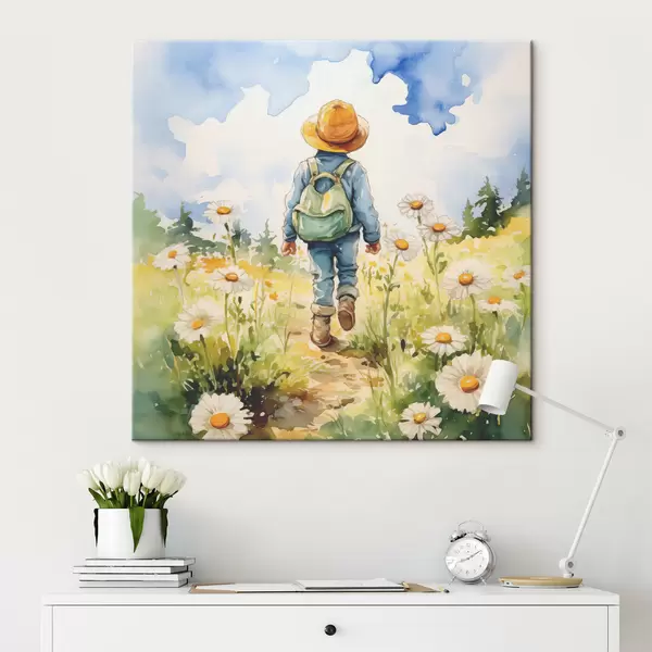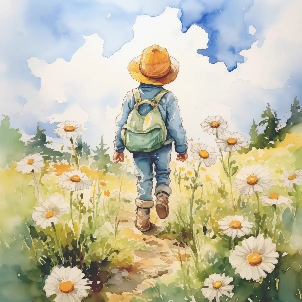 Glezna Zēns kovboju cepurē ar zaļu mugursomu aiz muguras un zilu uzvalku iet pa taku kumelīšu laukā, akvarelis s38946