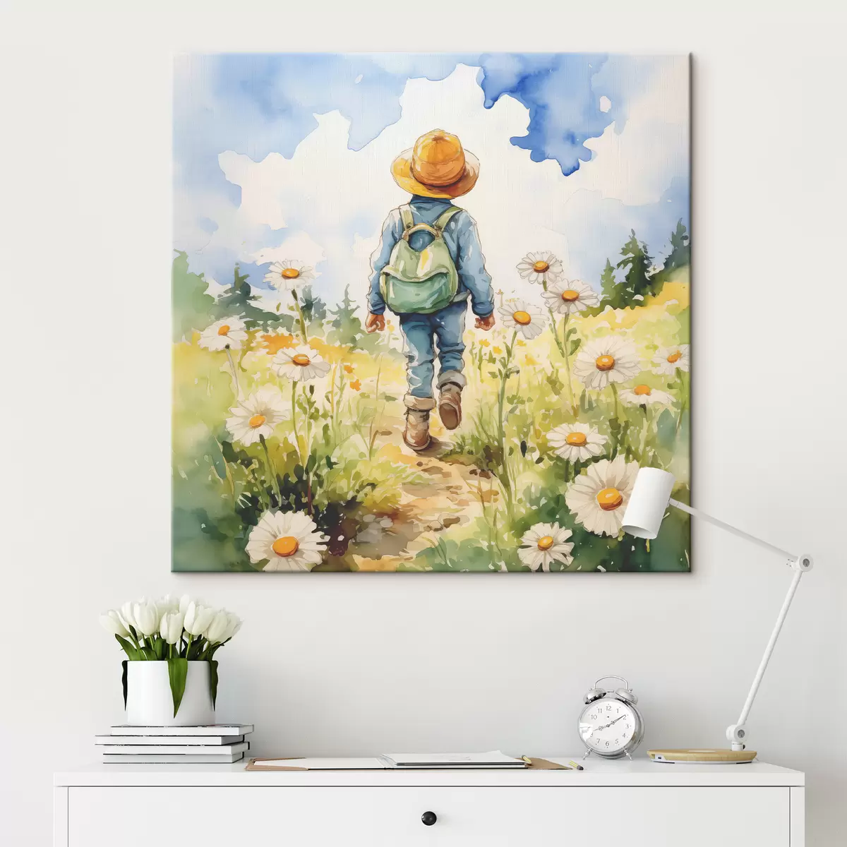 Glezna Zēns kovboju cepurē ar zaļu mugursomu aiz muguras un zilu uzvalku iet pa taku kumelīšu laukā, akvarelis Nr s38946