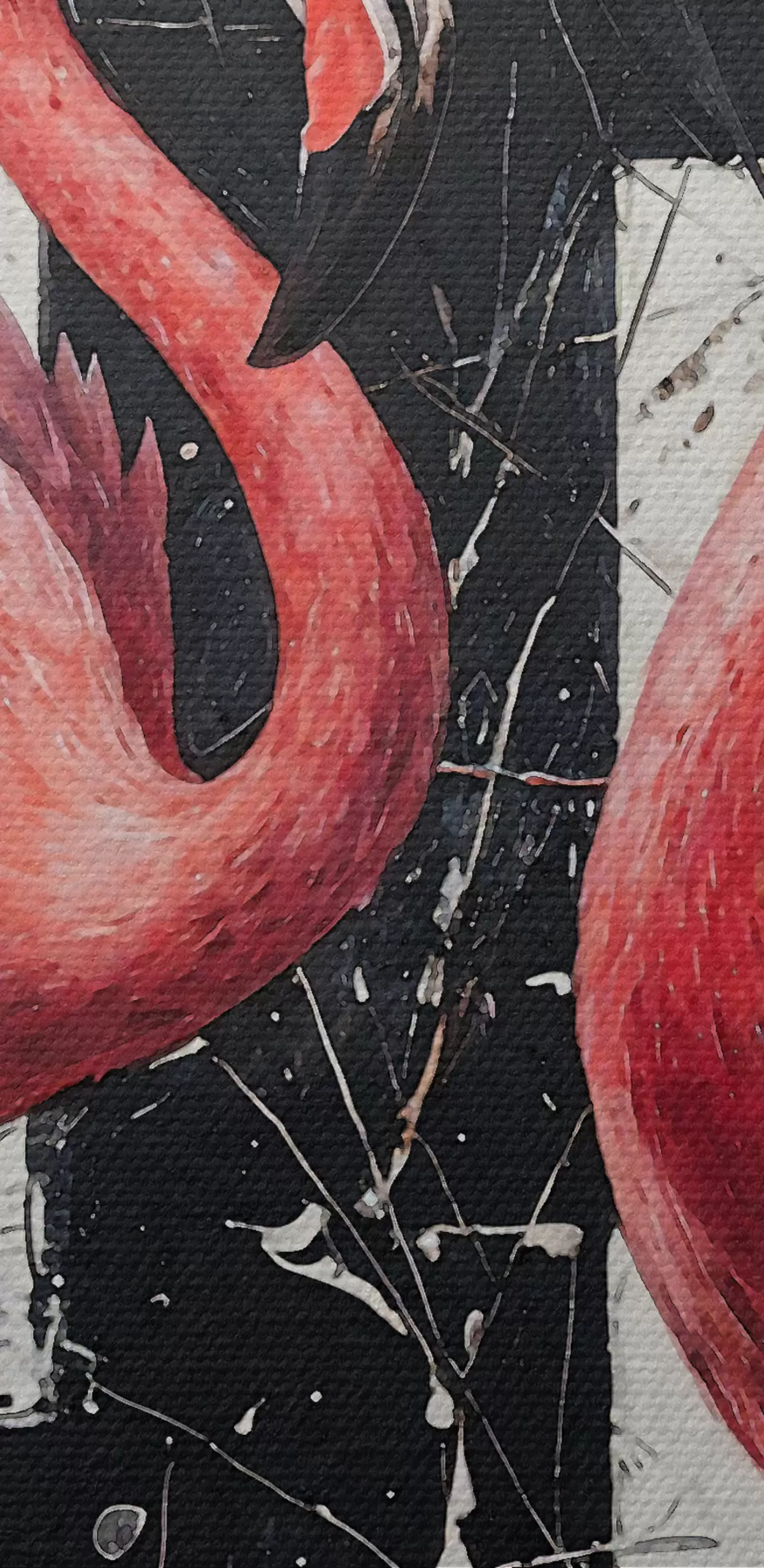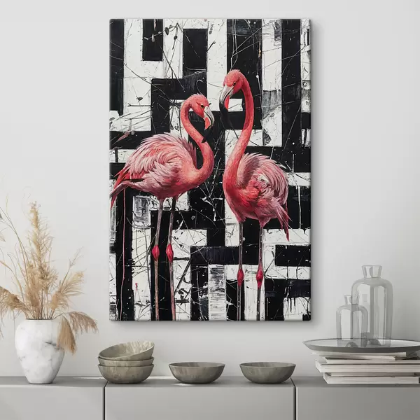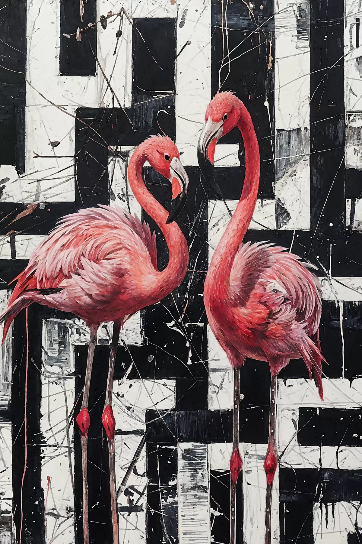 Glezna Divi rozā flamingo stāv pretī melnbaltai abstraktai fona mākslas gleznai Nr s38954