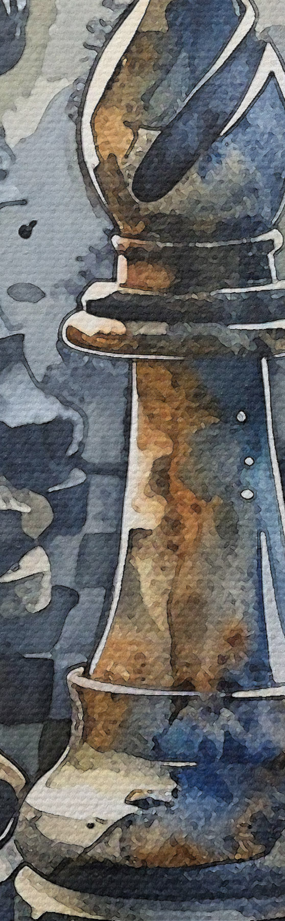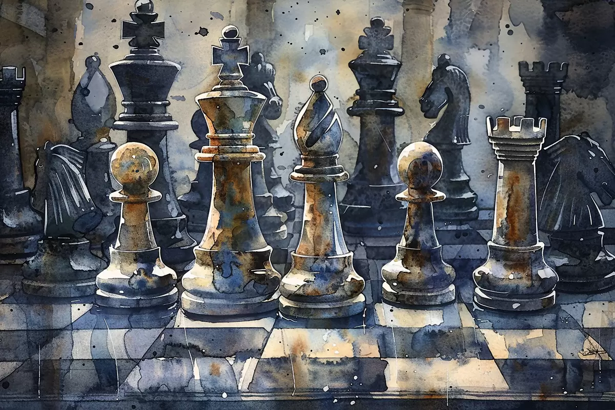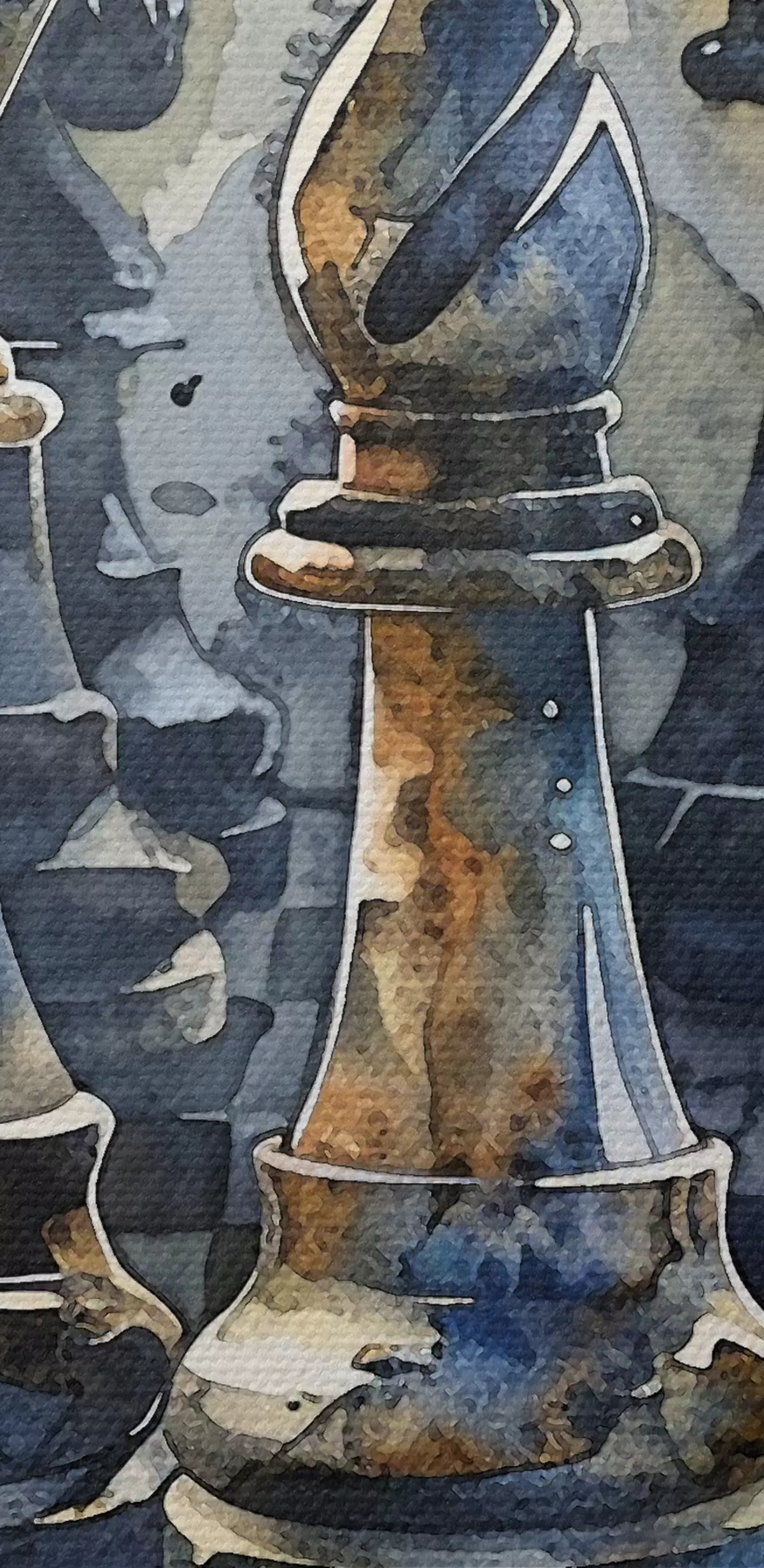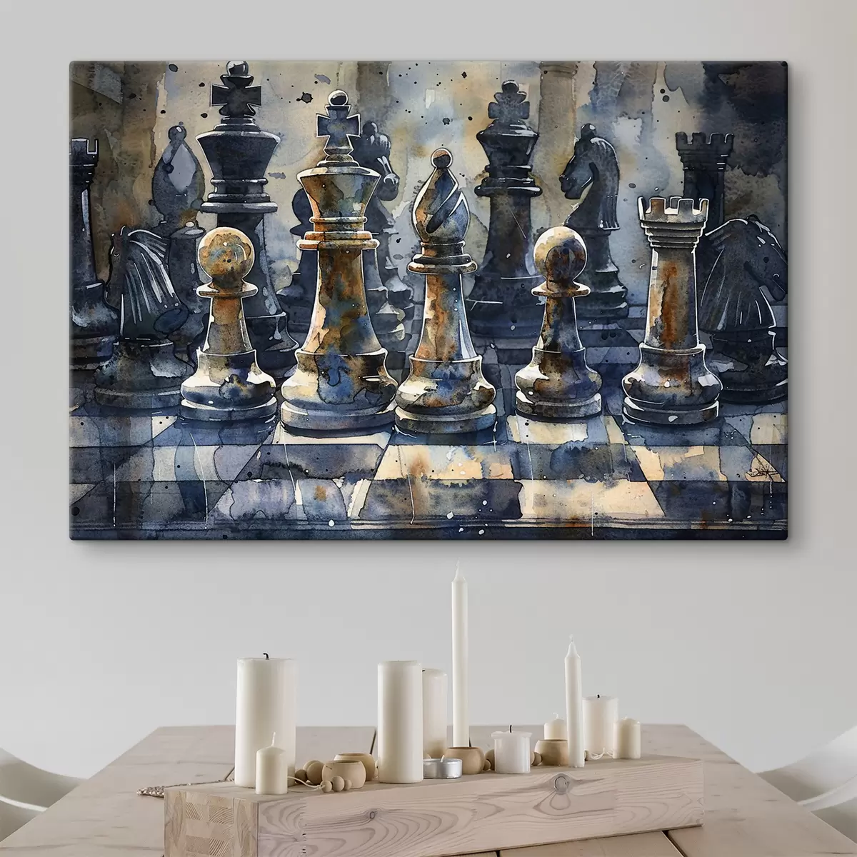 Glezna Akvareļglezna tuvplāna skats uz šahu, kas izgatavots no metāla vai akmens, ar detalizētiem dizainiem un faktūrām s38960