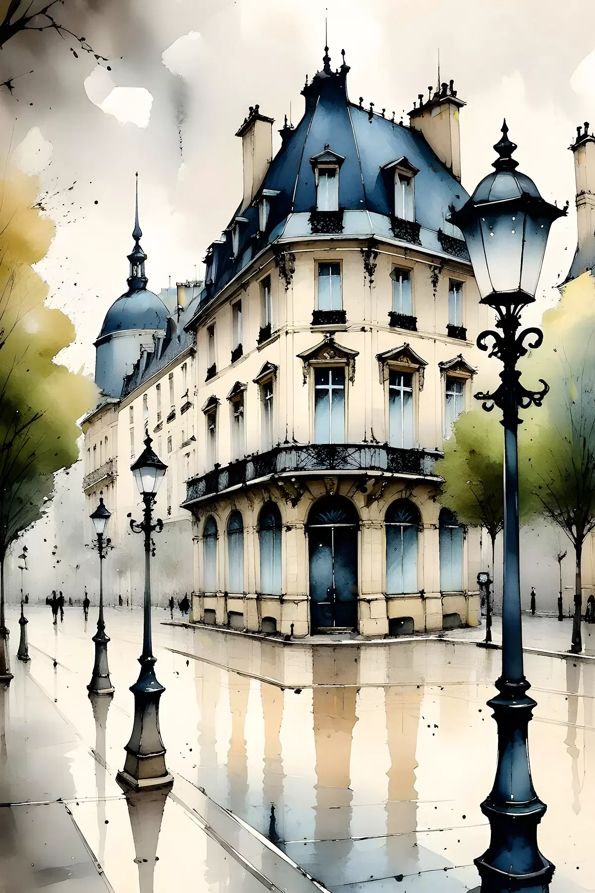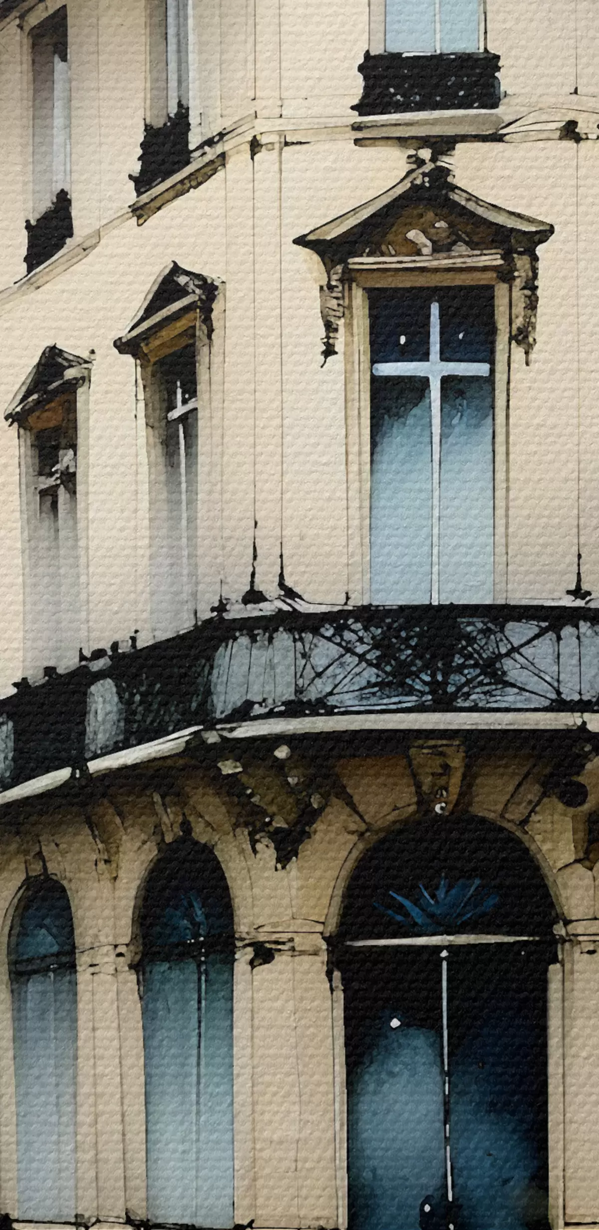 Glezna Vēsturiskas ēkas akvareļglezna ar izliektu fasādi un dekoratīviem arhitektūras elementiem Nr s38975