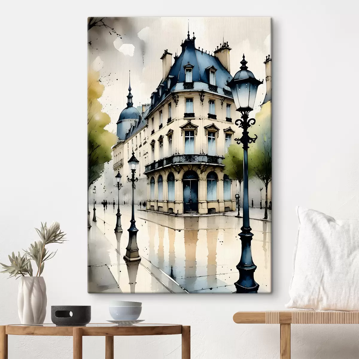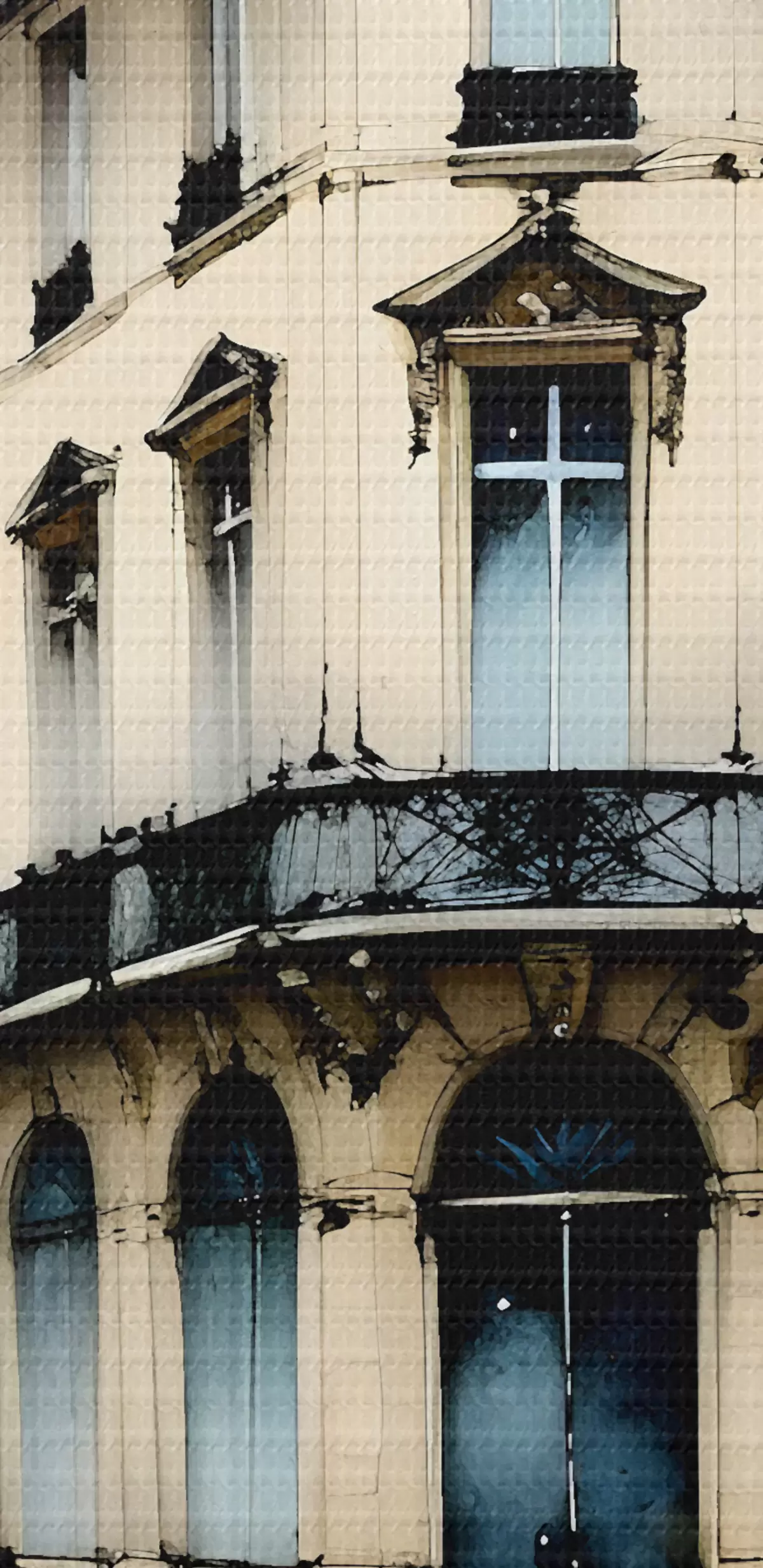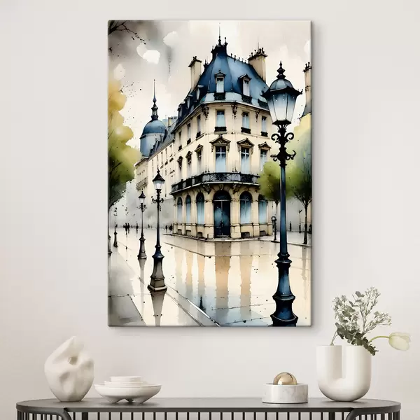 Glezna Vēsturiskas ēkas akvareļglezna ar izliektu fasādi un dekoratīviem arhitektūras elementiem s38975