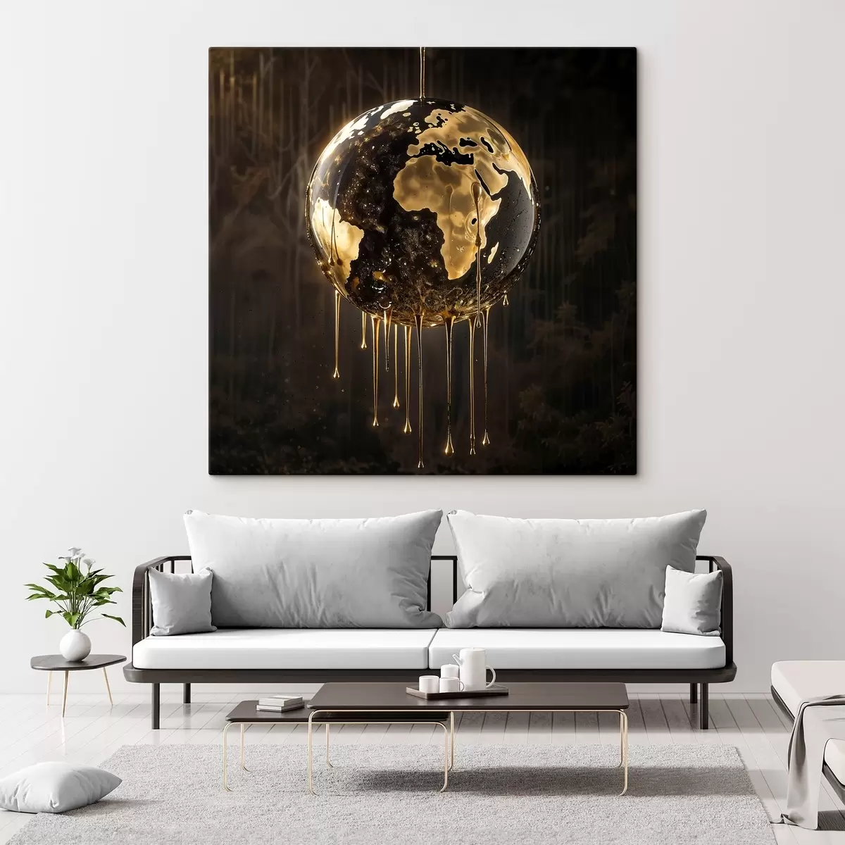 Glezna Kvēlojošs globuss, kas attēlo Zemi, ko ieskauj pilošs šķidrums uz tumša fona Nr s38983