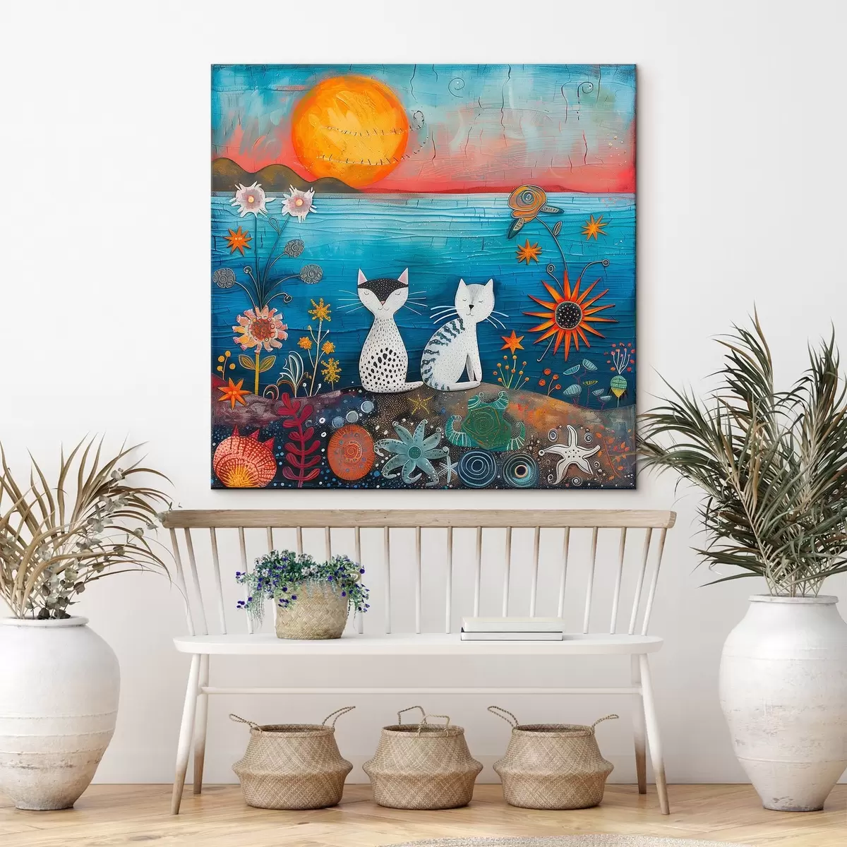 Glezna Kaķi saulrietā, krāsaini ziedi Nr s39085