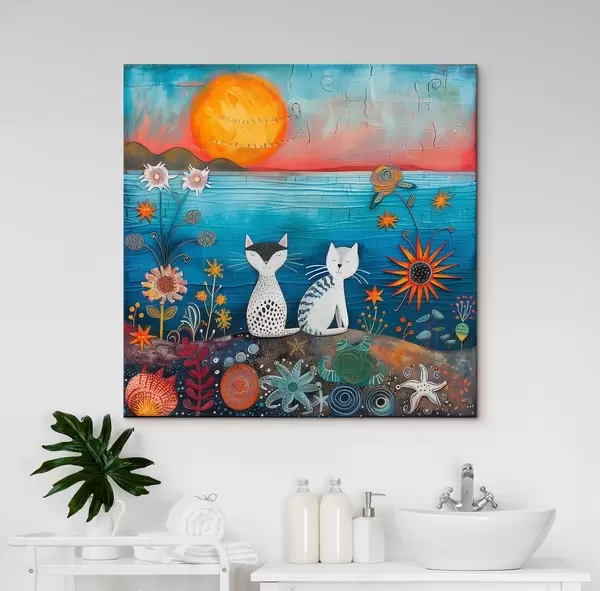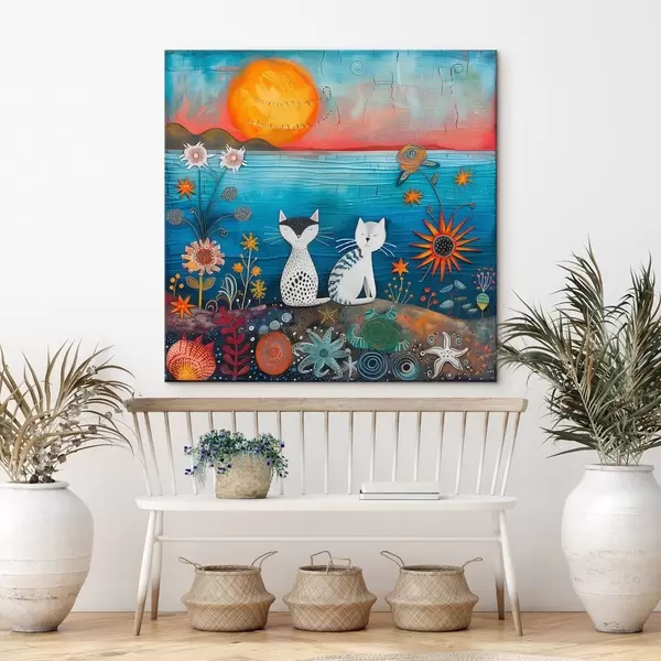 Glezna Kaķi saulrietā, krāsaini ziedi s39085