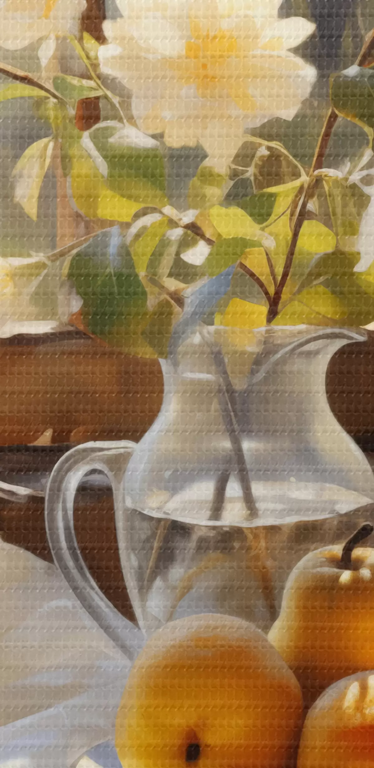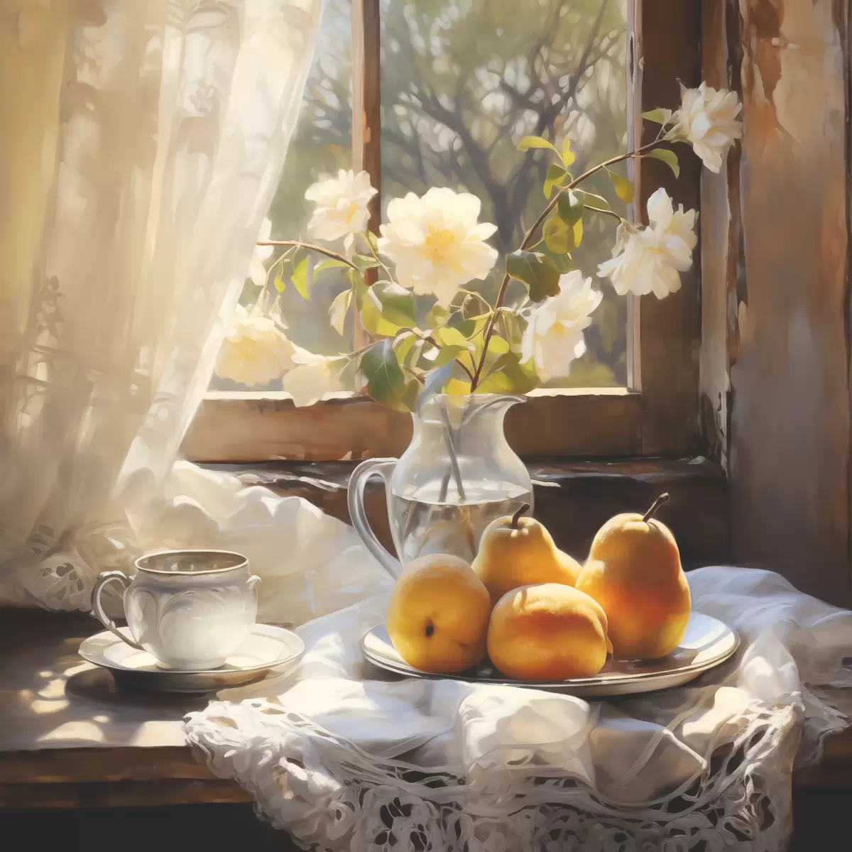 Glezna Lauku stila klusā daba no dzelteniem nogatavojušiem bumbieriem uz šķīvja uz galda pie loga, baltas rozes stikla krūzē, balti mežģīņu aizkari Nr s39129