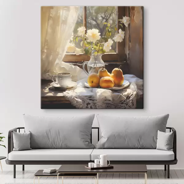 Glezna Lauku stila klusā daba no dzelteniem nogatavojušiem bumbieriem uz šķīvja uz galda pie loga, baltas rozes stikla krūzē, balti mežģīņu aizkari Nr s39129