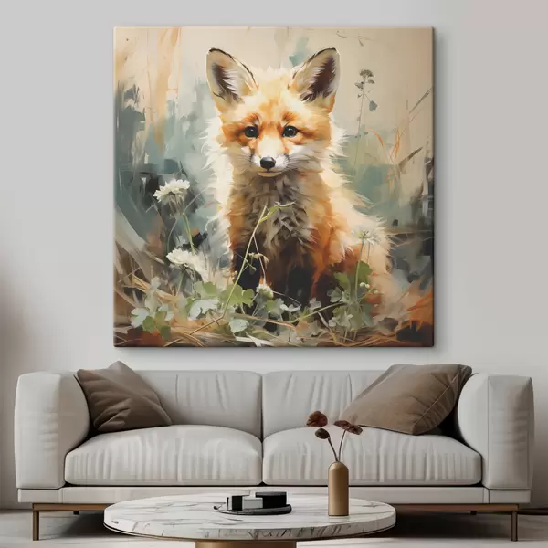Glezna Sarkanā lapsa, kas sēž sausā zālē, uz zaļa fona, eļļas glezna s39191