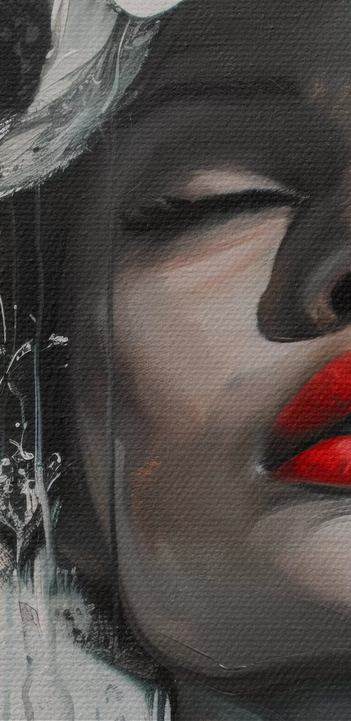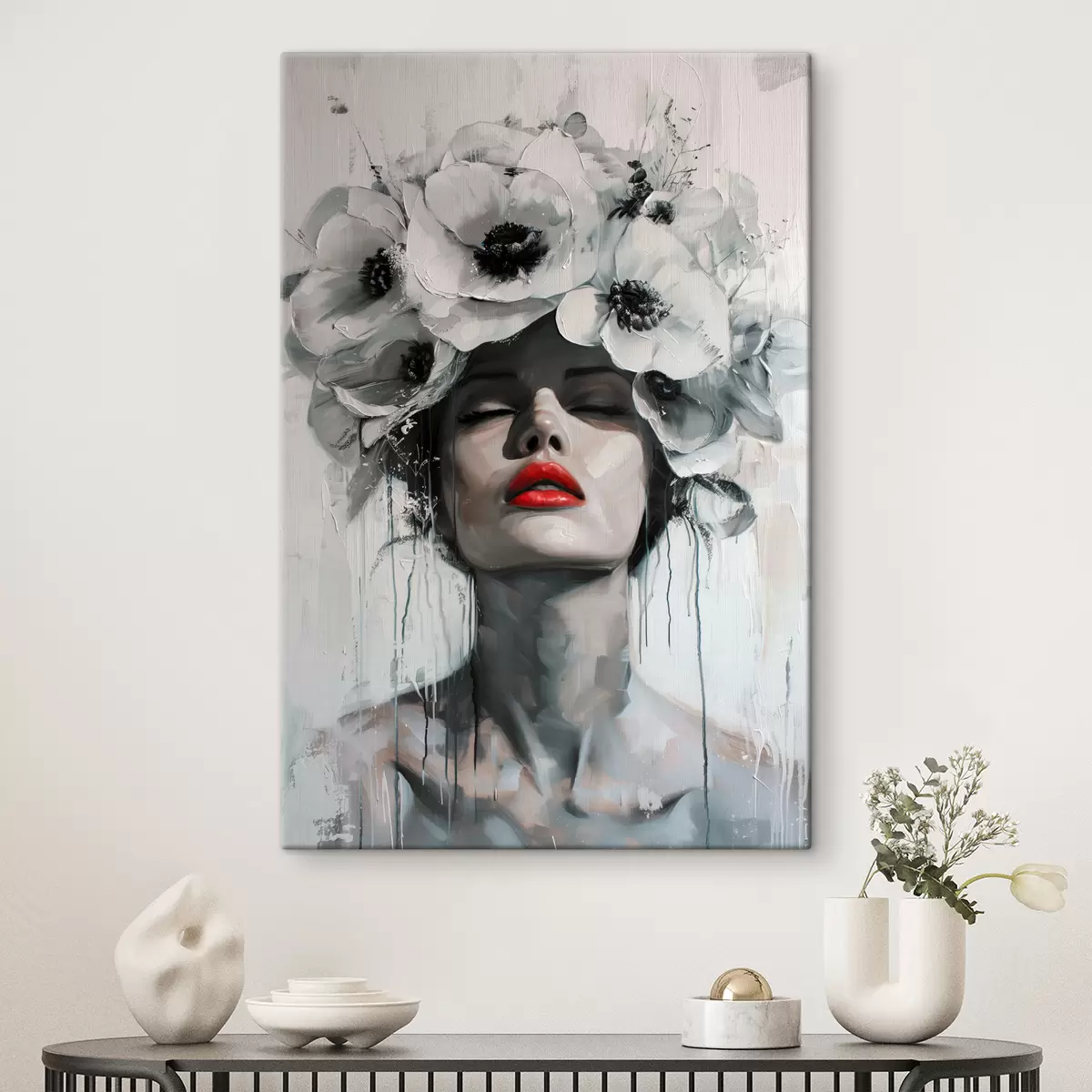 Glezna Sievietes portrets ar ziediem matos un sarkanām lūpām Nr s39253