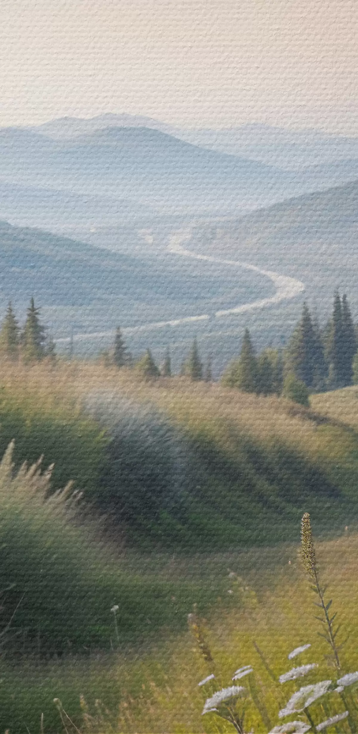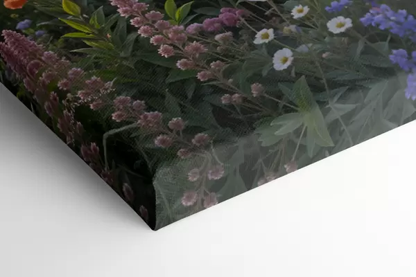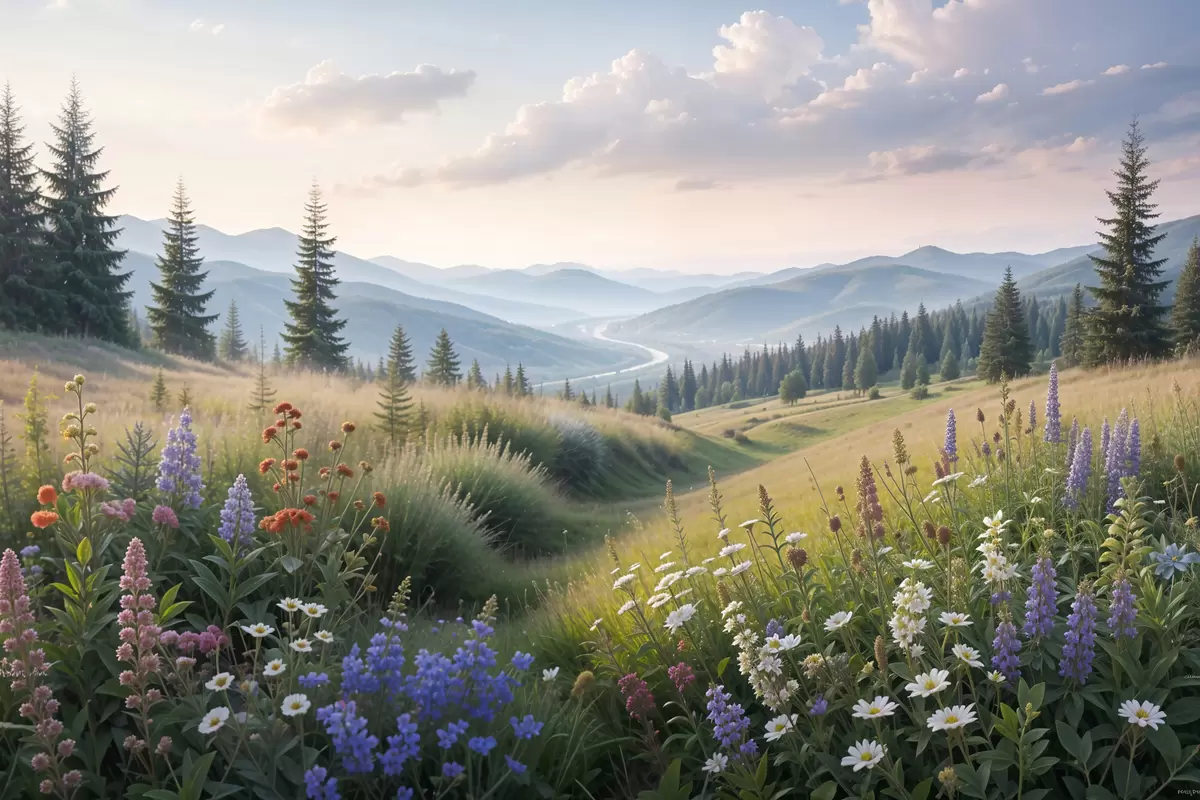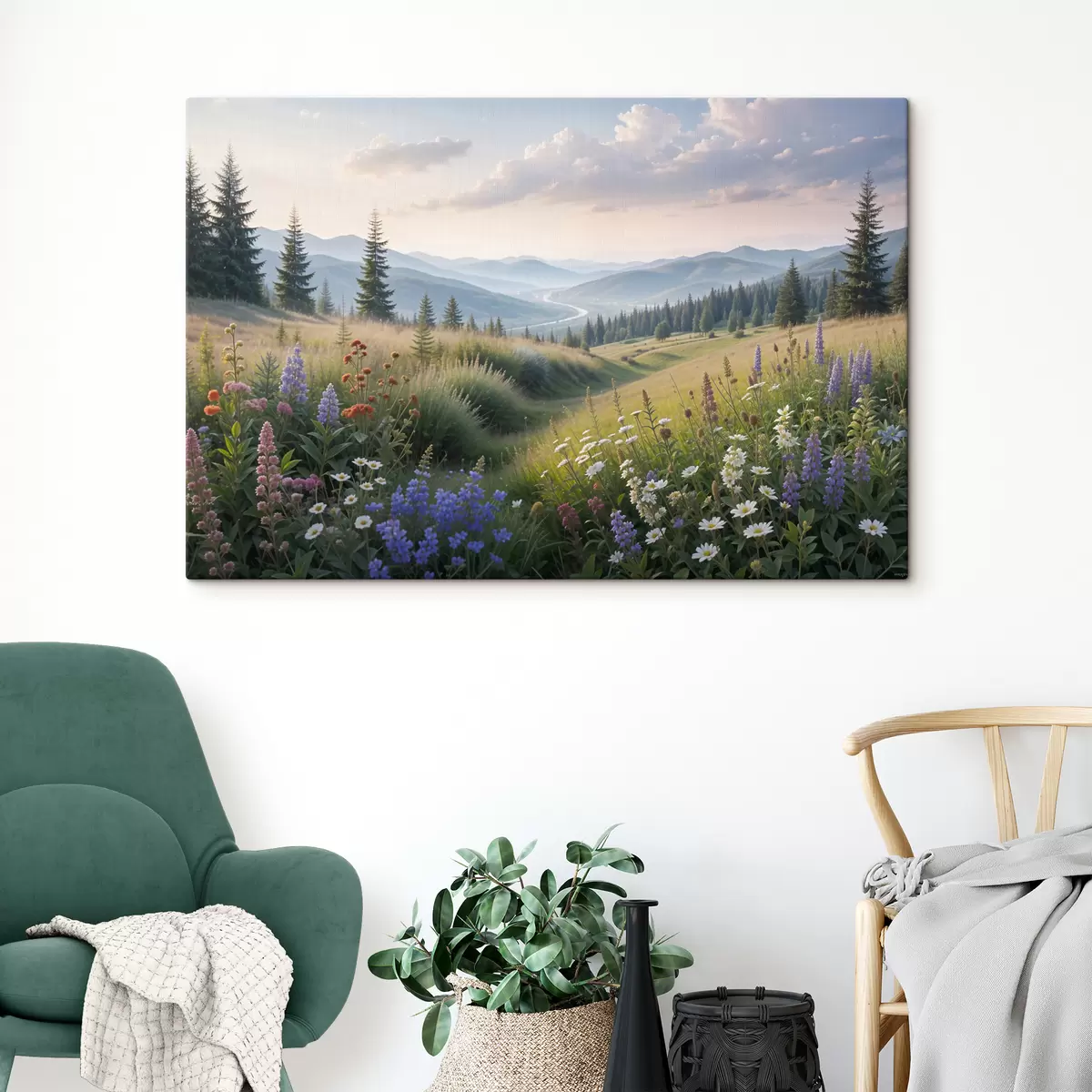 Glezna Kalnu ainava ar zālaugu pļavu priekšplānā, kas piepildīta ar krāsainiem savvaļas ziediem Nr s39382