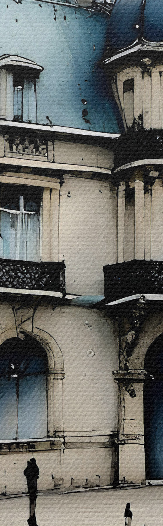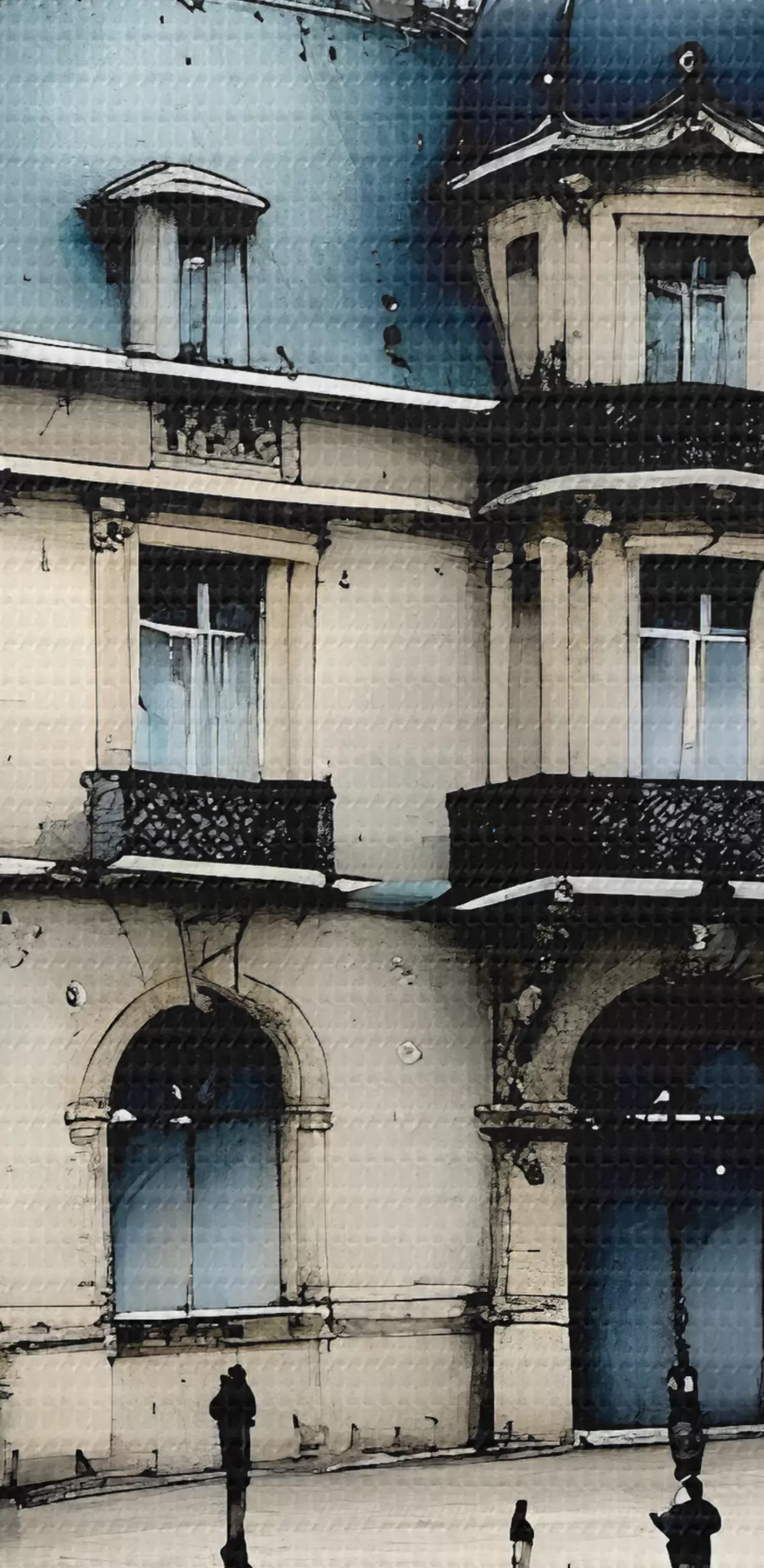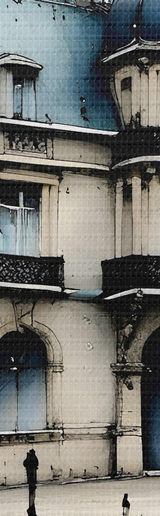 Glezna Lieliska akvareļu ēka, ko ieskauj laternu stabi un koki, lietainā dienā Nr s39391