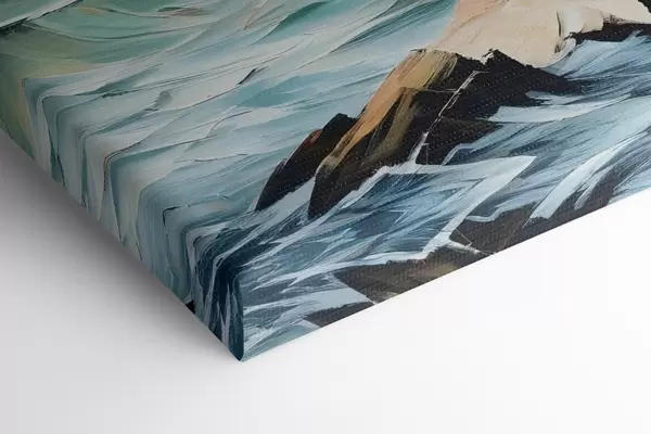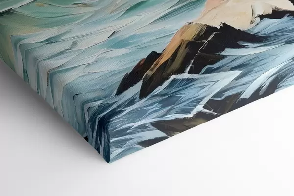Glezna Glezna ar sarkanu bāku, kas stāv augstu uz akmeņainas klints, ko ieskauj krītoši viļņi un vētrainas debesis Nr s39392