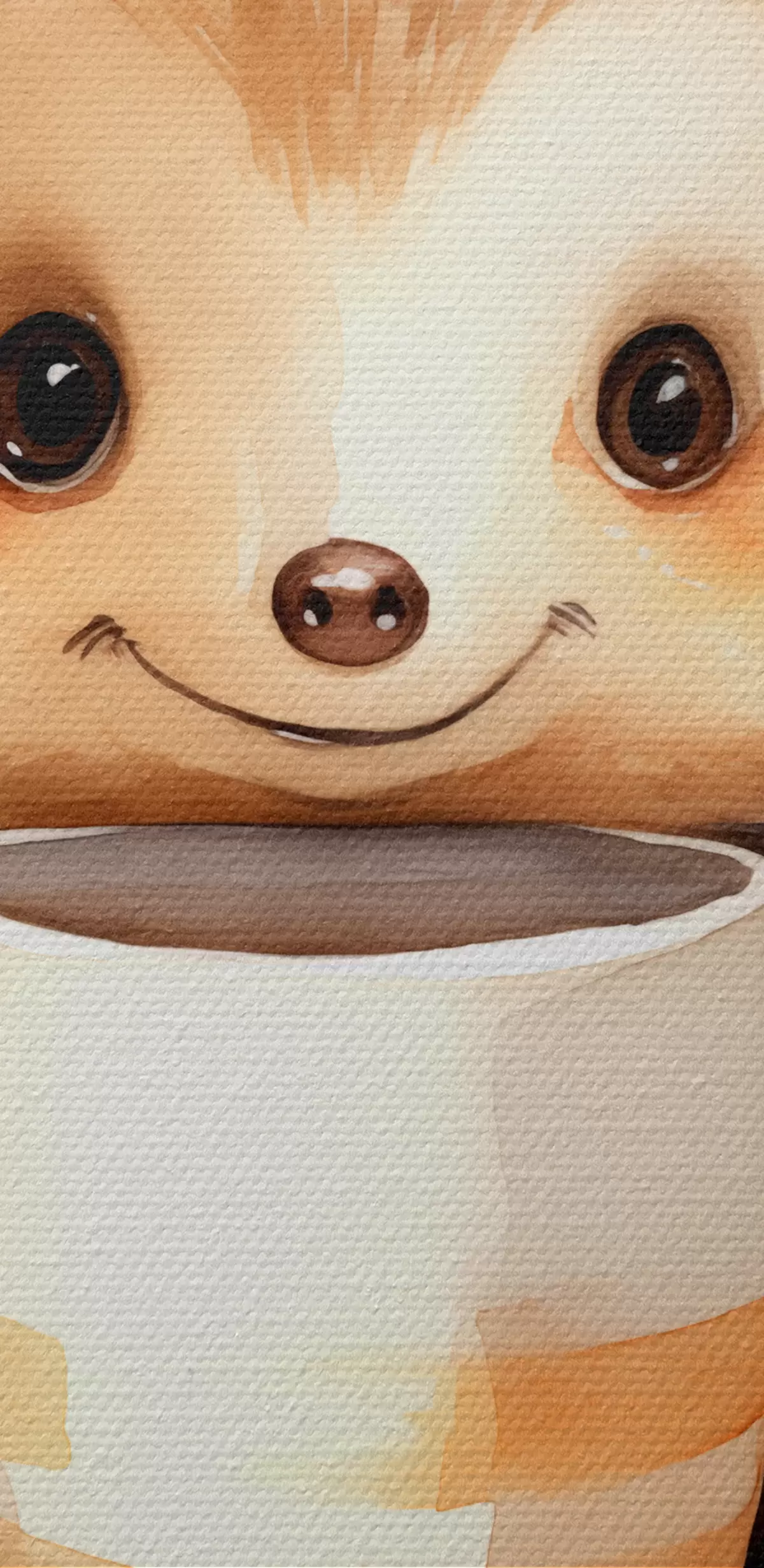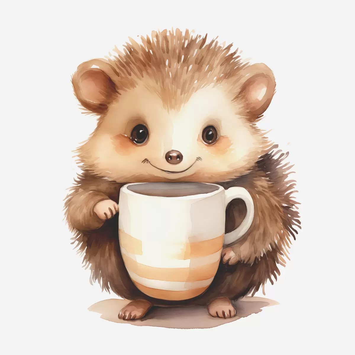 Glezna Ezītis, kas tur ķepās baltu krūzīti, akvareļa bērnu ilustrāciju Nr s39440