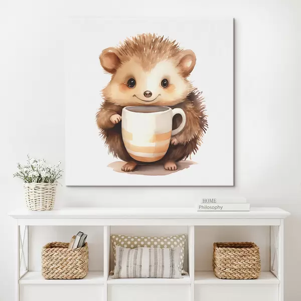 Glezna Ezītis, kas tur ķepās baltu krūzīti, akvareļa bērnu ilustrāciju Nr s39440