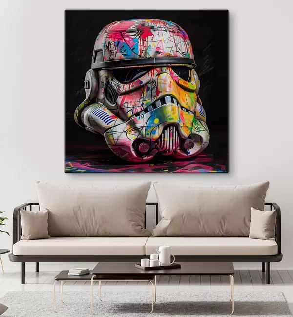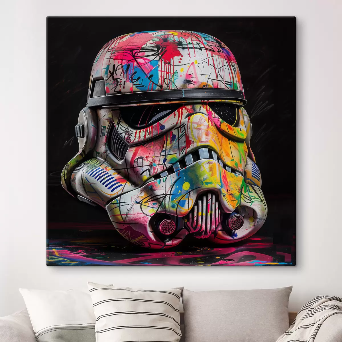 Glezna Zvaigžņu karu uzbrukuma ķivere, kas pārklāta ar košu ielu mākslu un grafiti Nr s39453