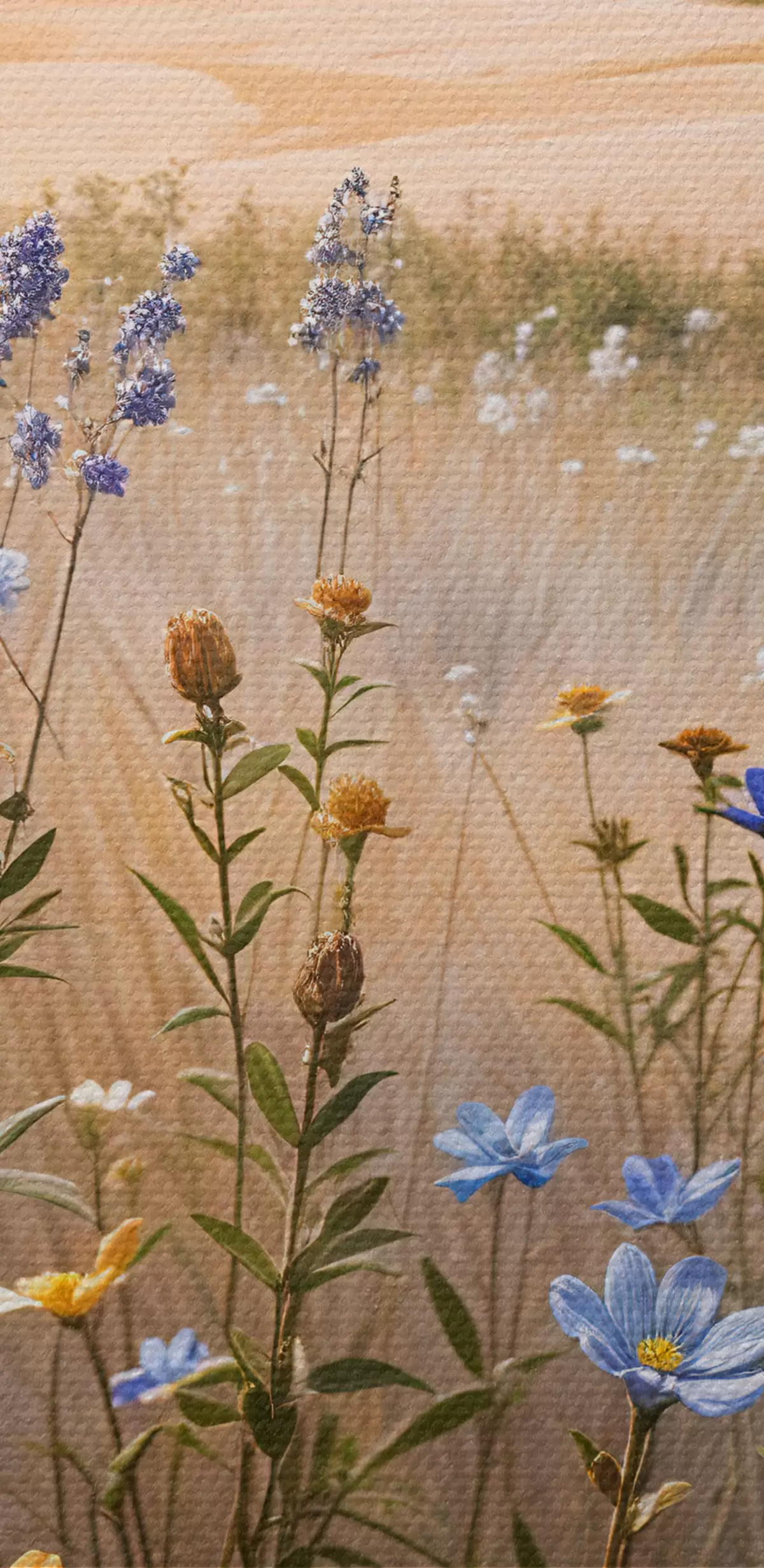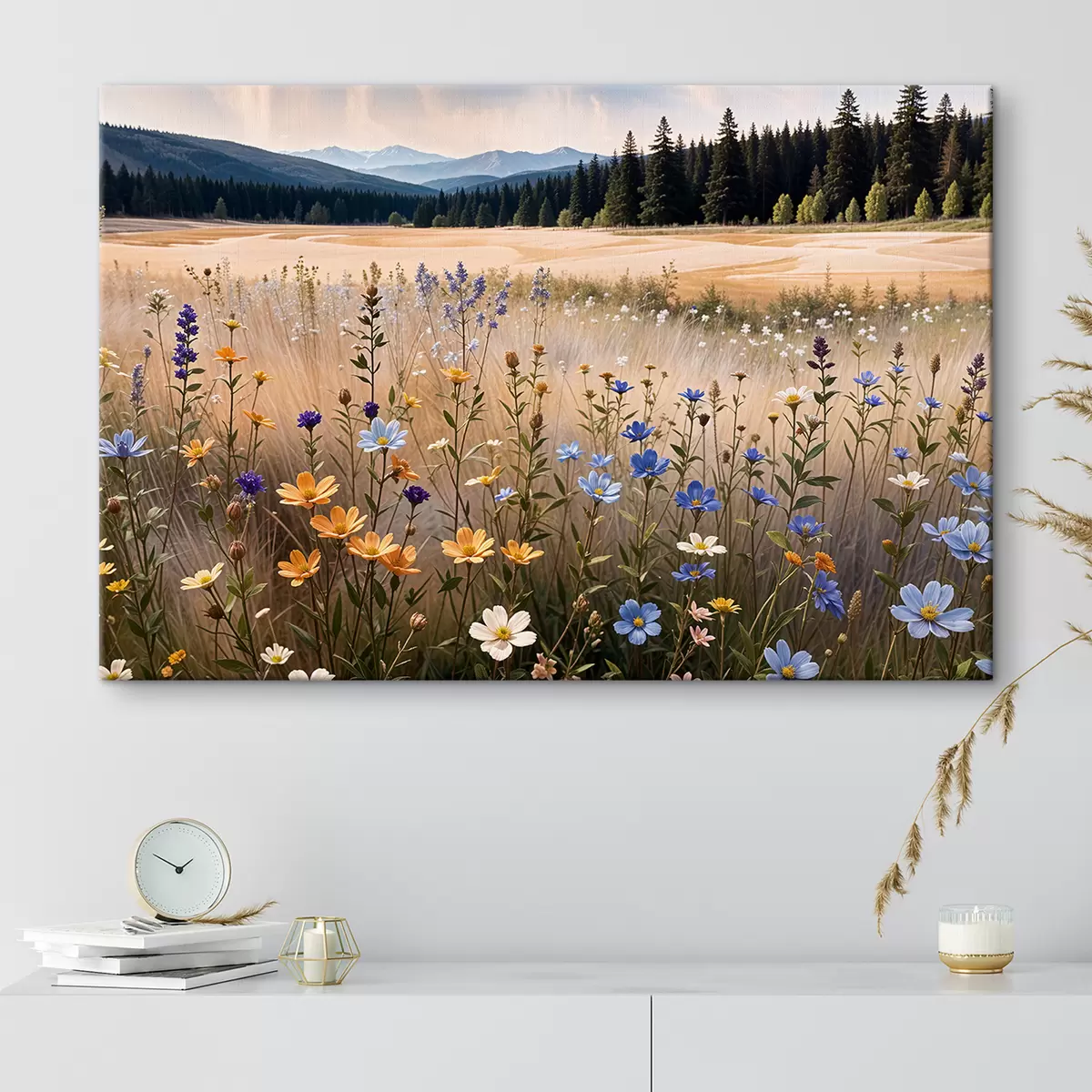 Glezna Priekšplānā krāsainu savvaļas ziedu lauks ar ezeru un kalniem fonā Nr s39502