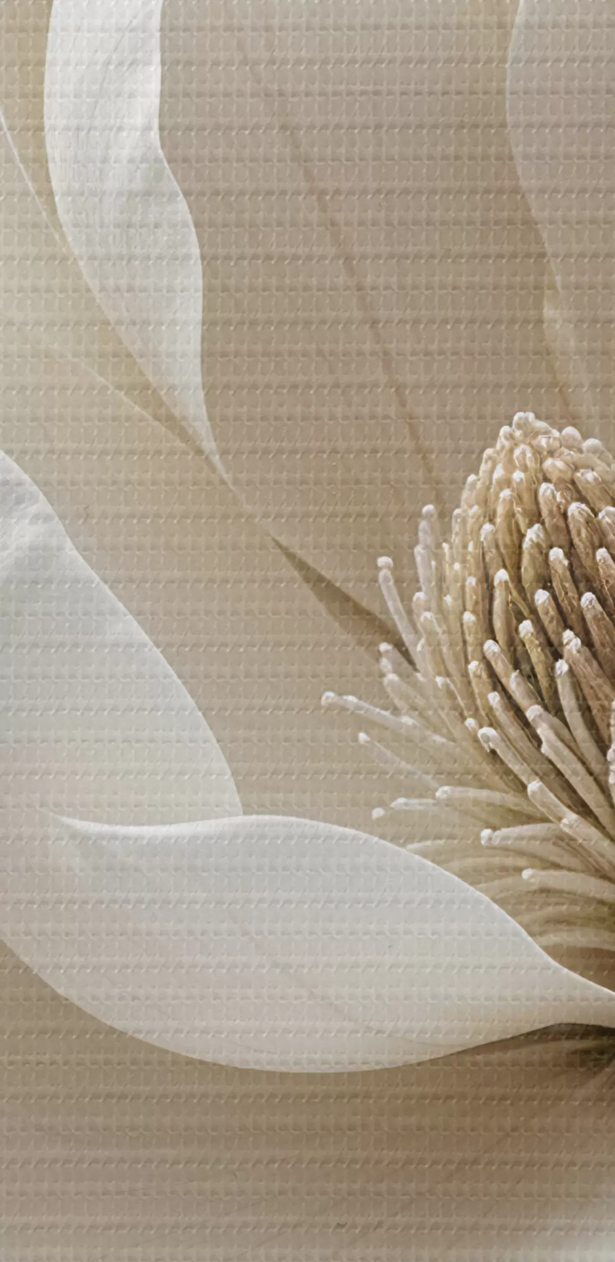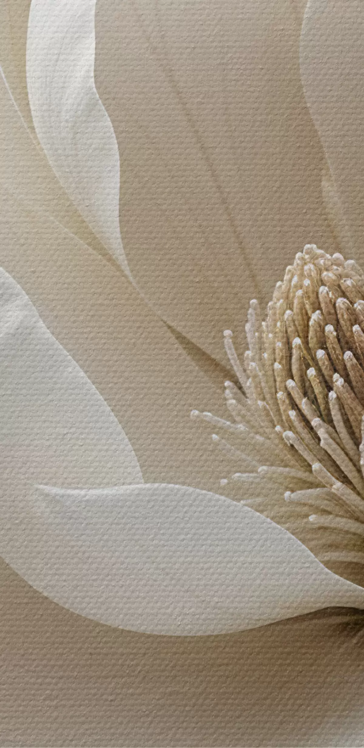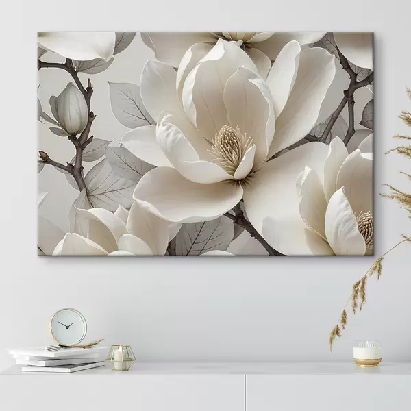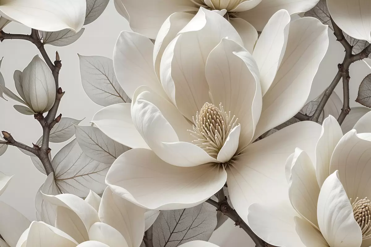 Glezna Balts magnolijas zieds ar smalkām ziedlapiņām, ko ieskauj zaļas lapas uz gaiša fona s39527