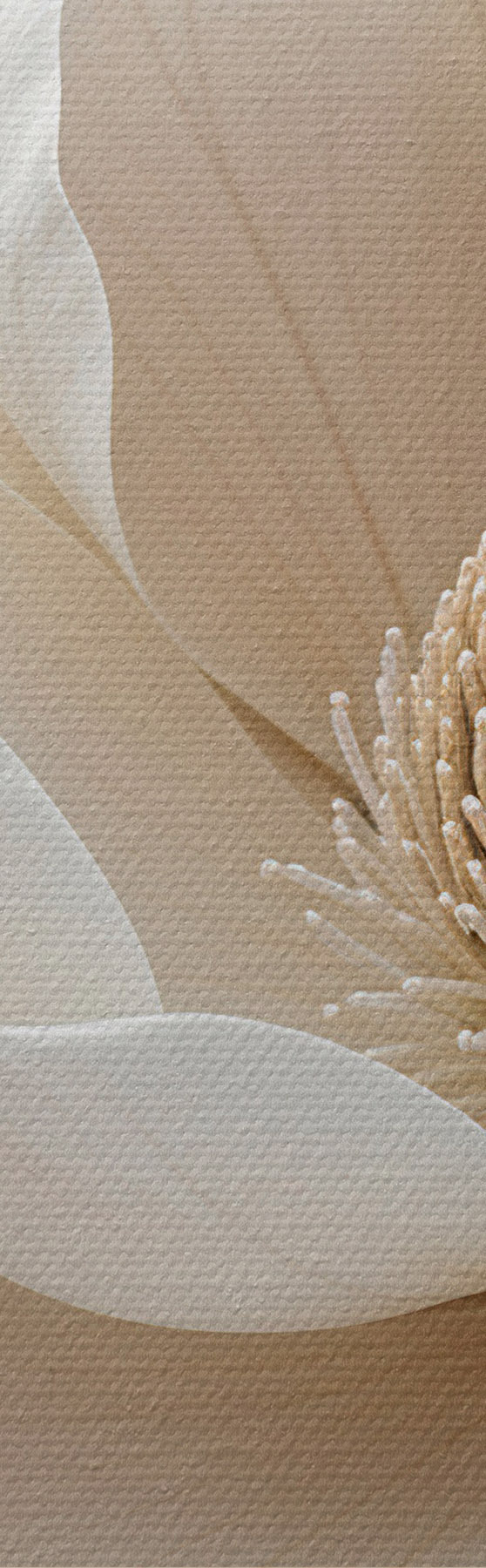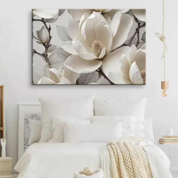 Glezna Balts magnolijas zieds ar smalkām ziedlapiņām, ko ieskauj zaļas lapas uz gaiša fona Nr s39527