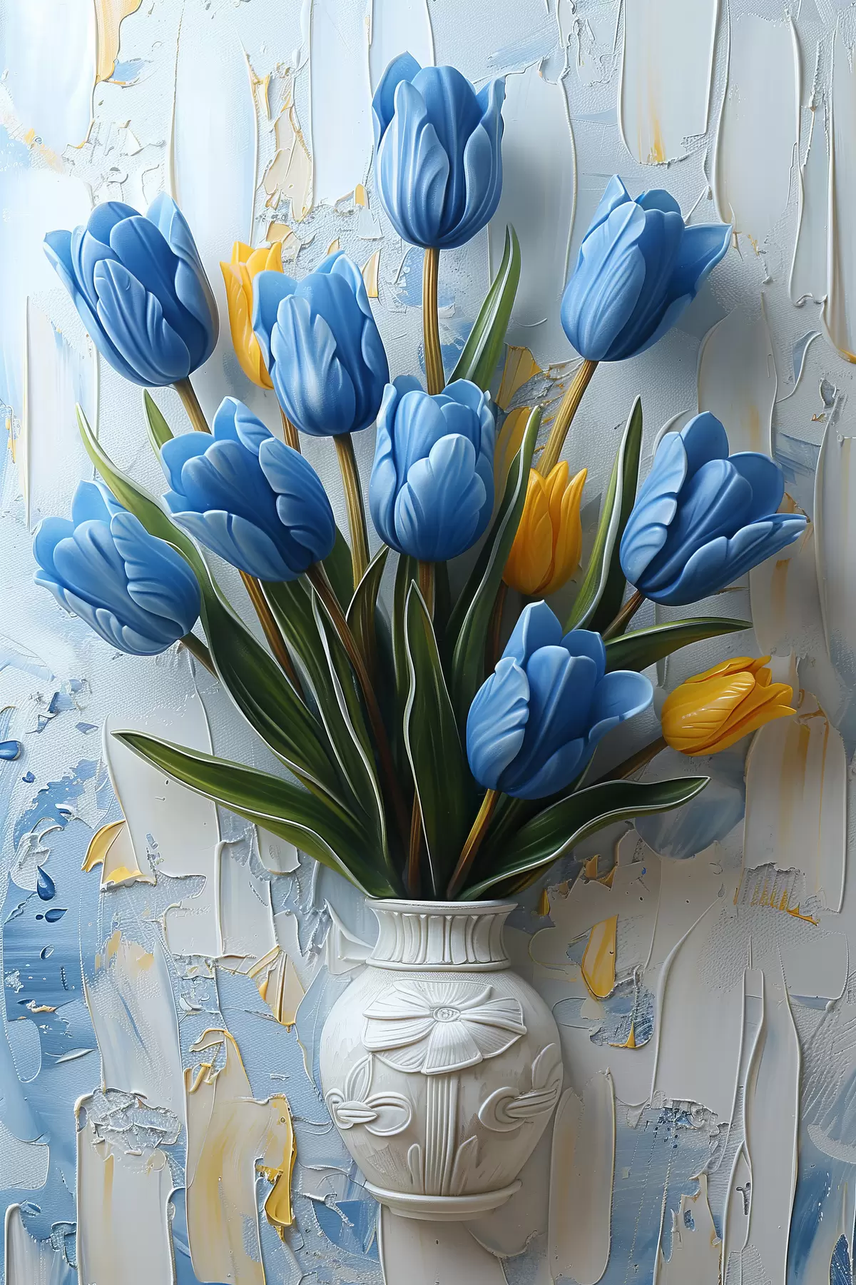 Glezna Zilas un dzeltenas tulpes 3D formātā: elegants eļļas krāsas sienas attēls ar baltu un gaiši zilu fonu un iegravēta vāze Nr s39637