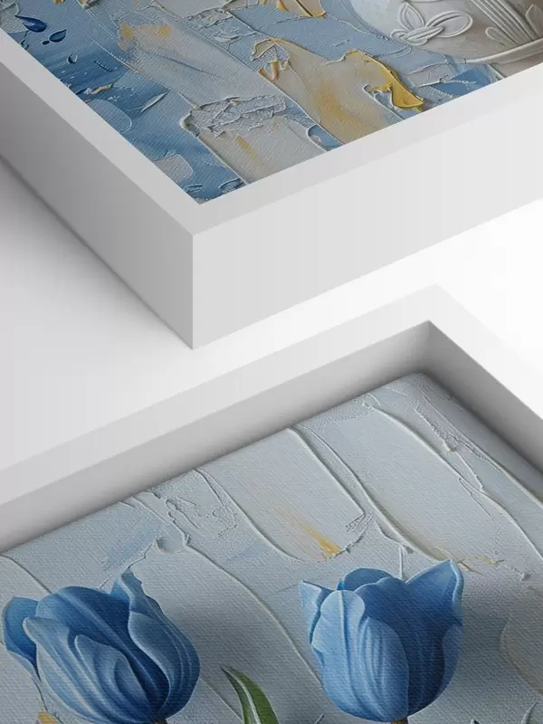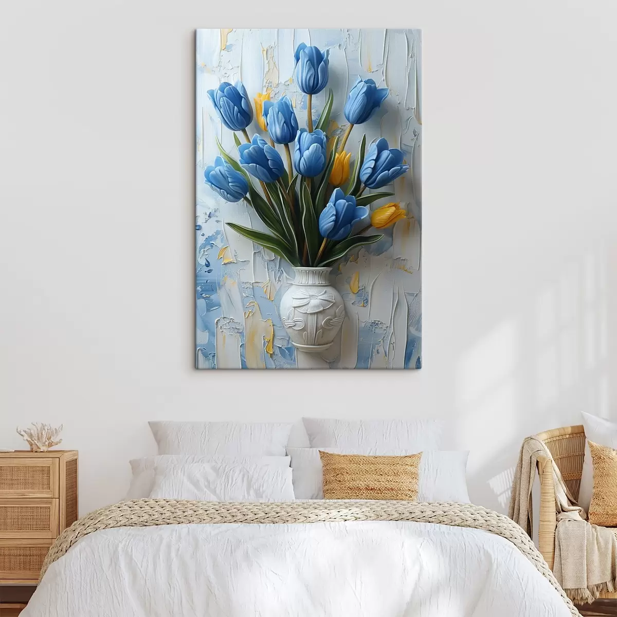 Glezna Zilas un dzeltenas tulpes 3D formātā: elegants eļļas krāsas sienas attēls ar baltu un gaiši zilu fonu un iegravēta vāze s39637