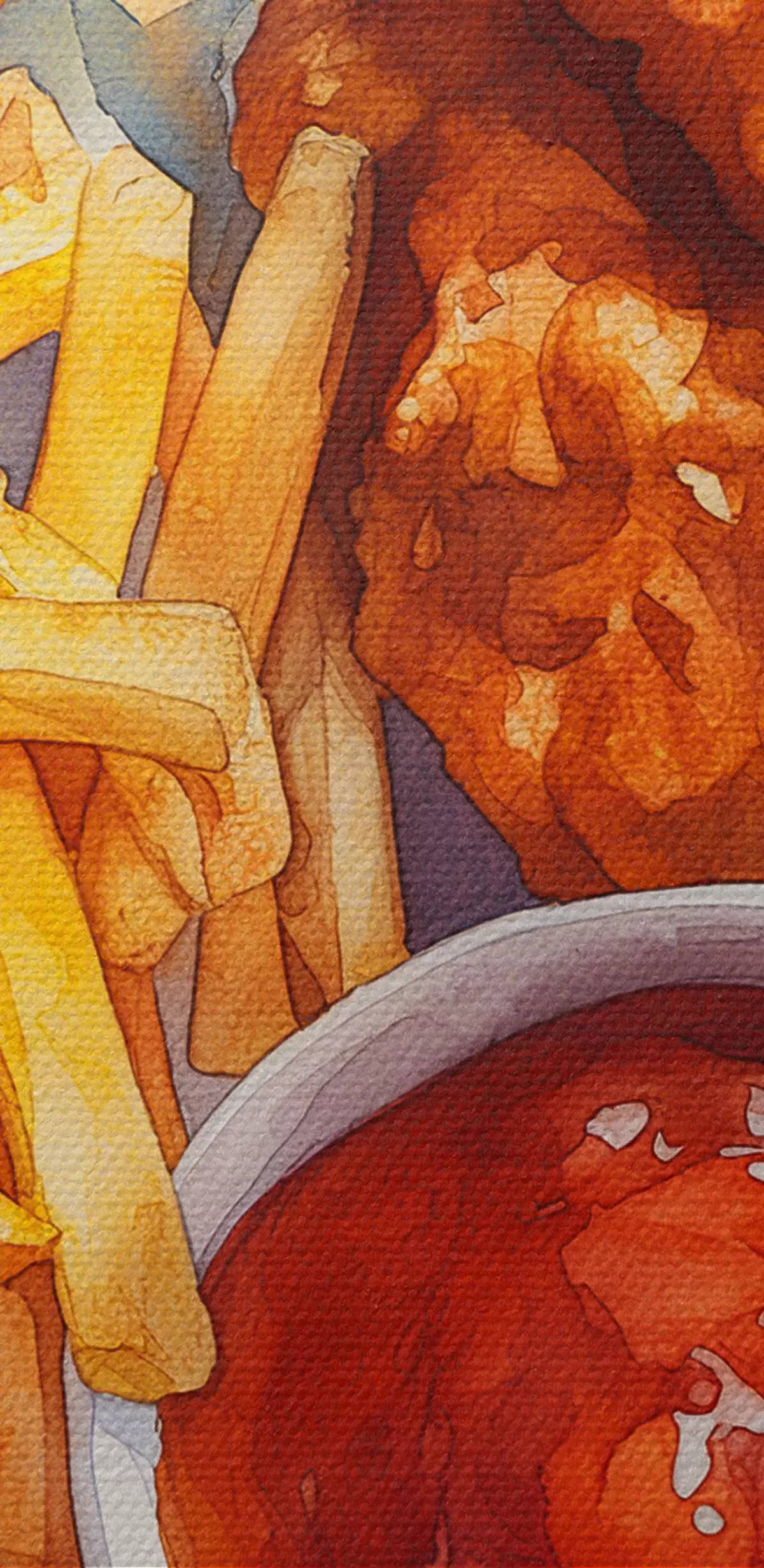 Glezna Akvareļu ielas ēdiens, frī kartupeļi ar ceptu vistu, garšīgi  s39709
