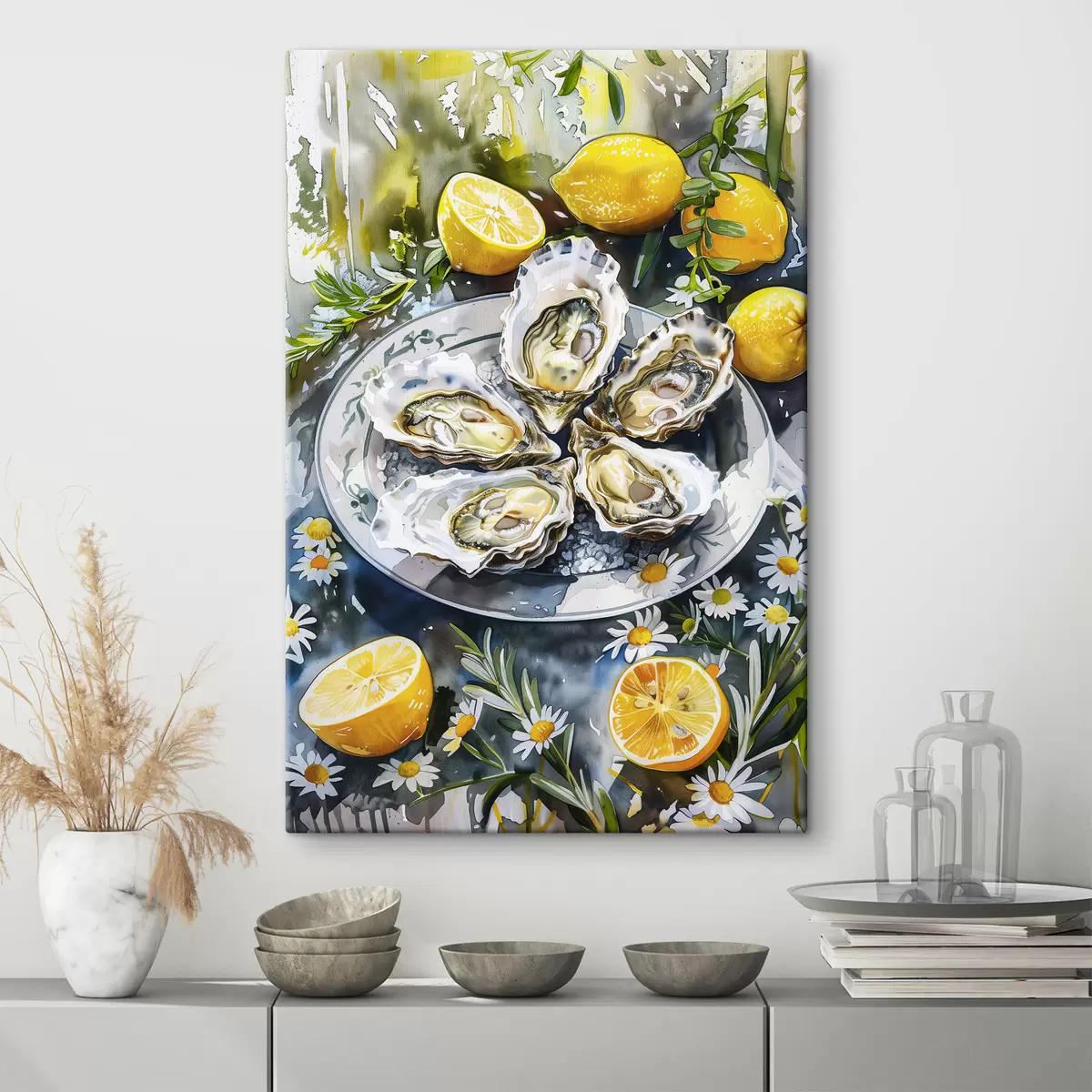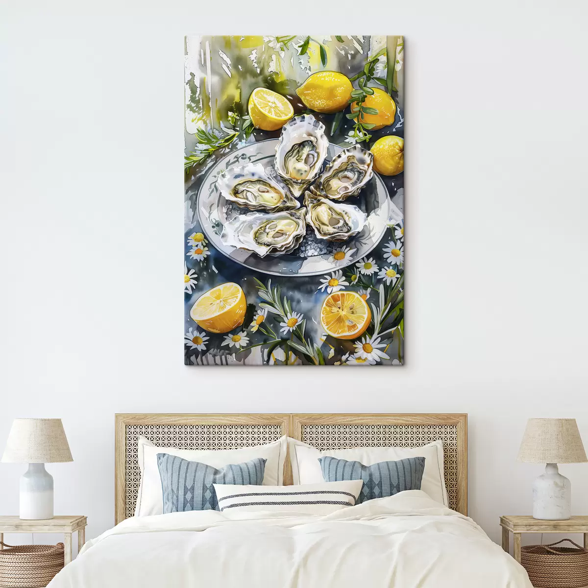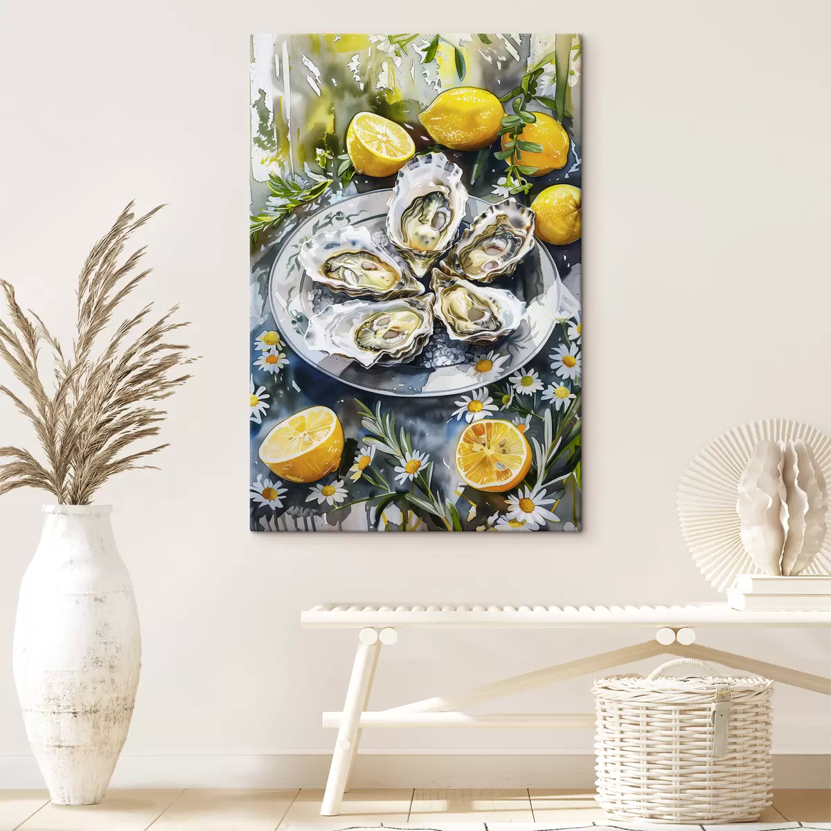 Glezna Elegantas austeres uz šķīvja, citroni un ziedi, vasaras krāsas, vidusjūras Nr s39710