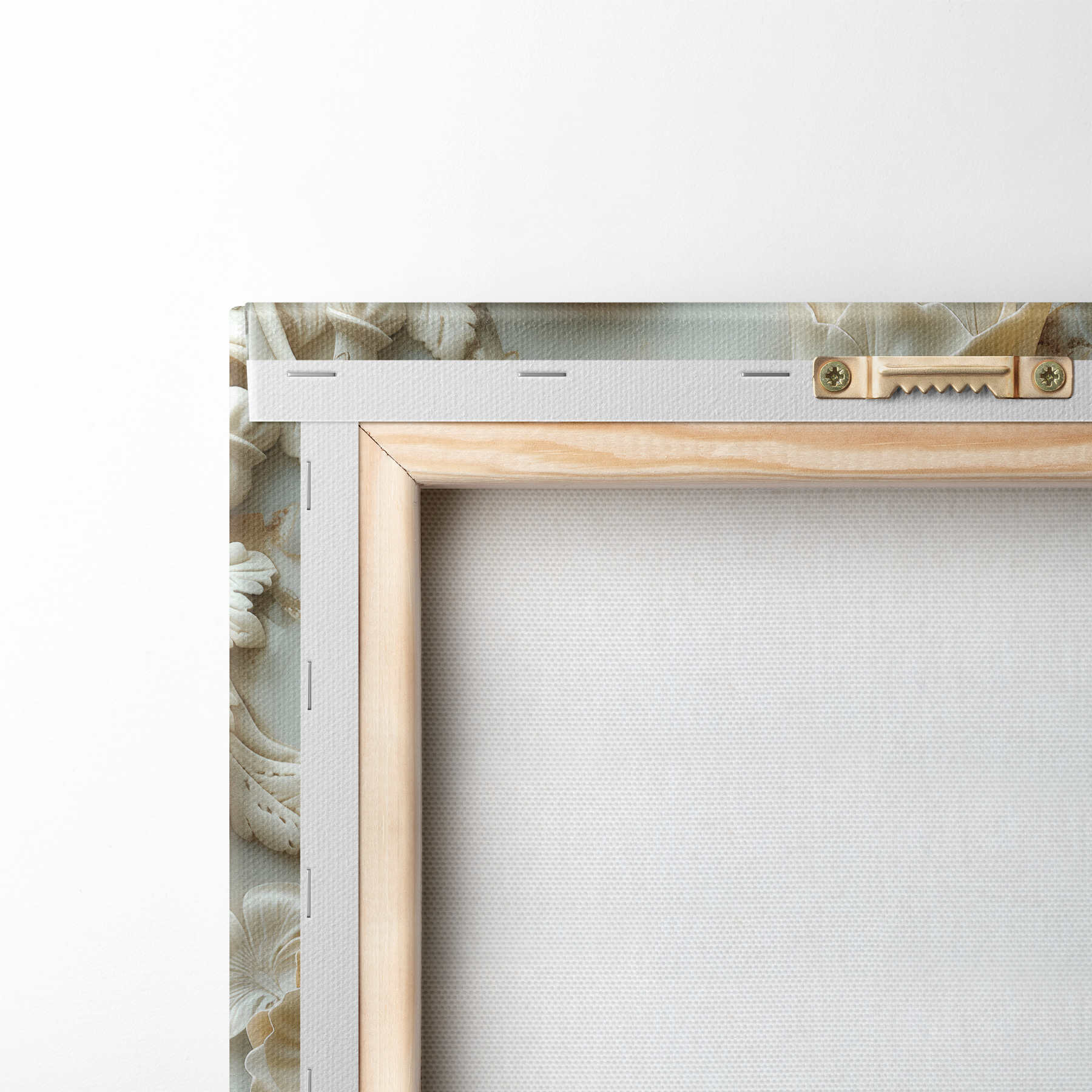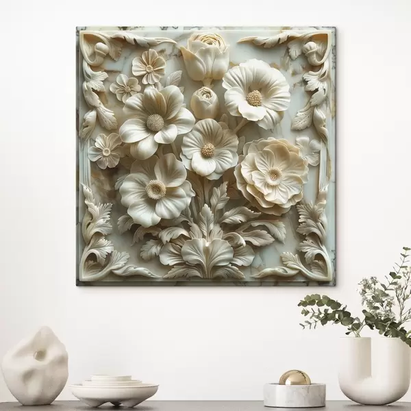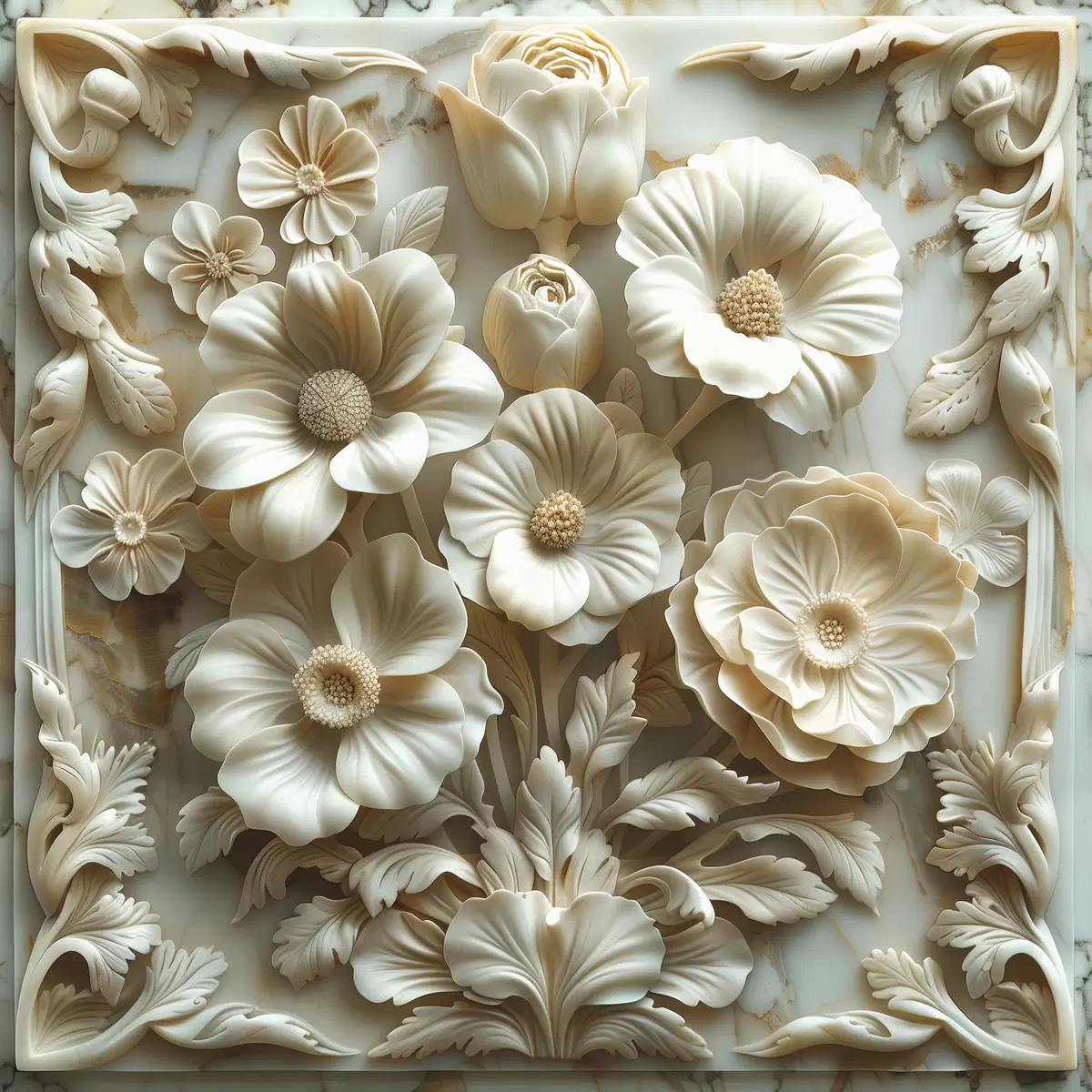 Glezna 3D balti bareljefa ziedi uz marmora fona ar rāmi Nr s39739